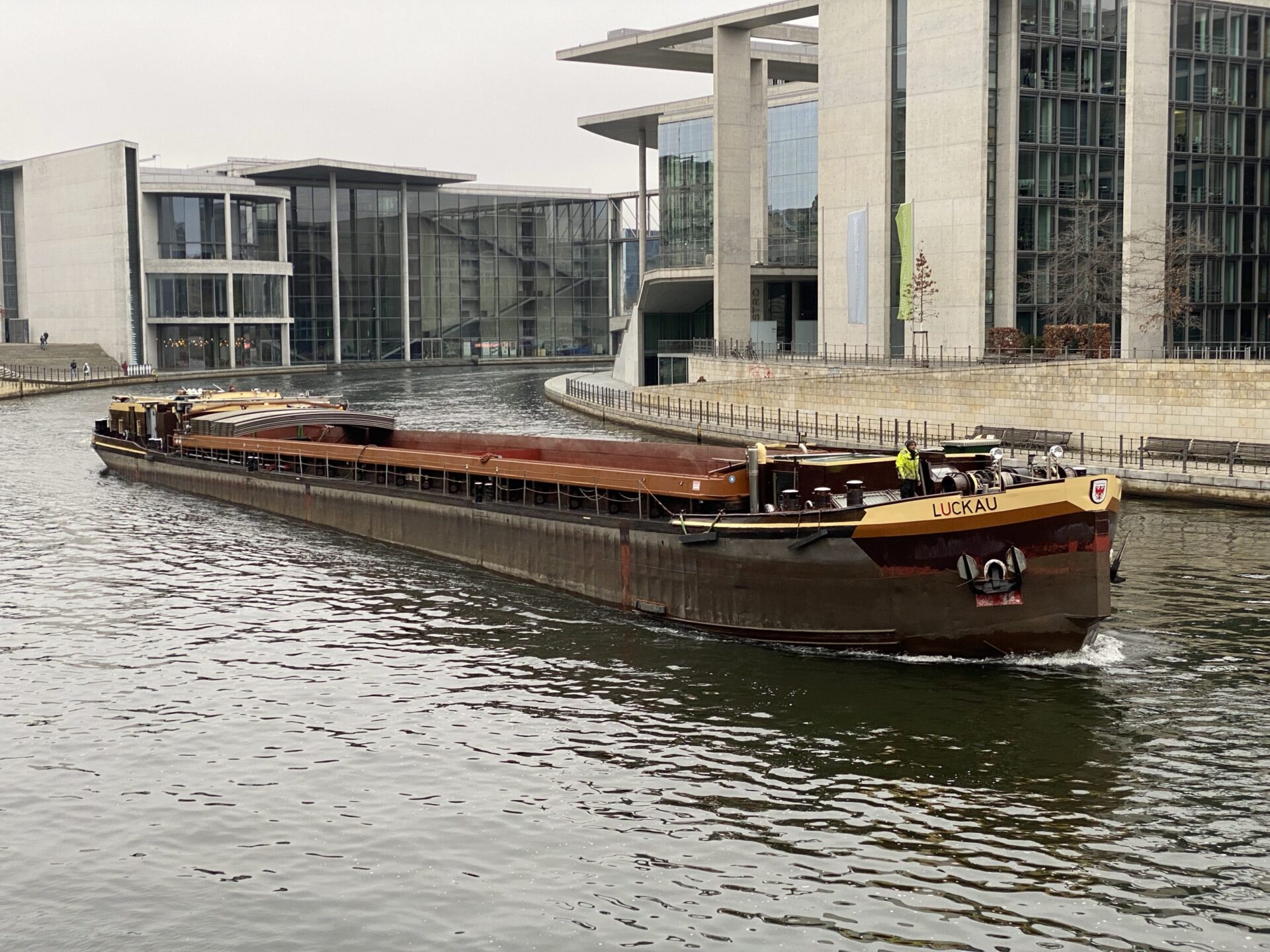 Having arrived in Berlin, I checked in at my hotel then went exploring. After a look around Museum island I headed over to the Reichstag for my pre-booked visit to the German Parliament. On the way, a large barge headed down the river towards me.