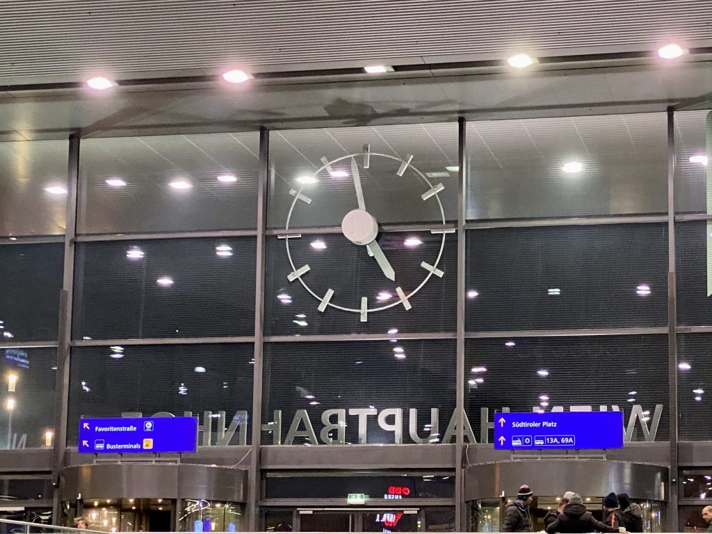 I was last in Vienna the day after Brexit, having taken a sleeper from Frankfurt. Probably the only city in mainland Europe that I’ve visited twice, and both times by rail. I was amused to notice that the station clock reads backwards from inside the concourse. Wonder how many people have been caught out by that over the years.