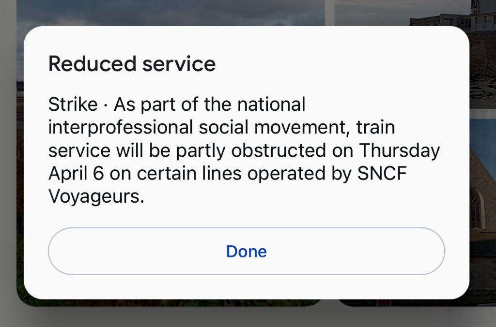 I’m getting quite used to it now. The journey is in my Interrail plan and activated, but I check the departure boards and its not there. I search online and it’s been cancelled by strikes. The alternative journeys are either cancelled or are not giving Interrail discounts. Time for another new plan.