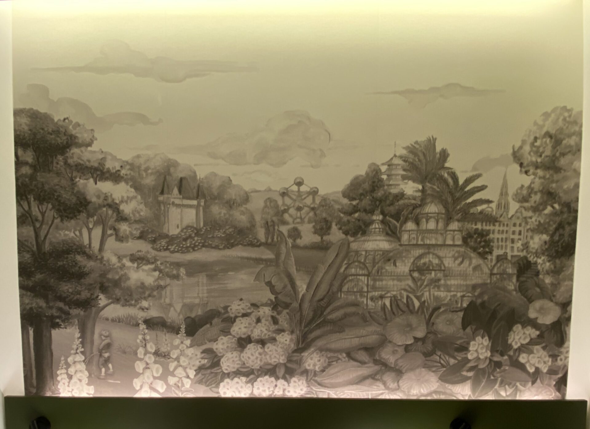 In the room there was a huge mural above the bed. By the bedside lamp there was a message to say to scan a QR code and it would load an application that would animate the mural. I have tested this and it does work on a phone from the photo I took, if you put it onto a reasonably large screen. Display them on a laptop/desktop, click the image to make it fill the screen, and point a phone at the QR code. Swap the large screen to the mural and accept the app that wants to run on the phone. Start on the left – look for the Manneken Pis character.
