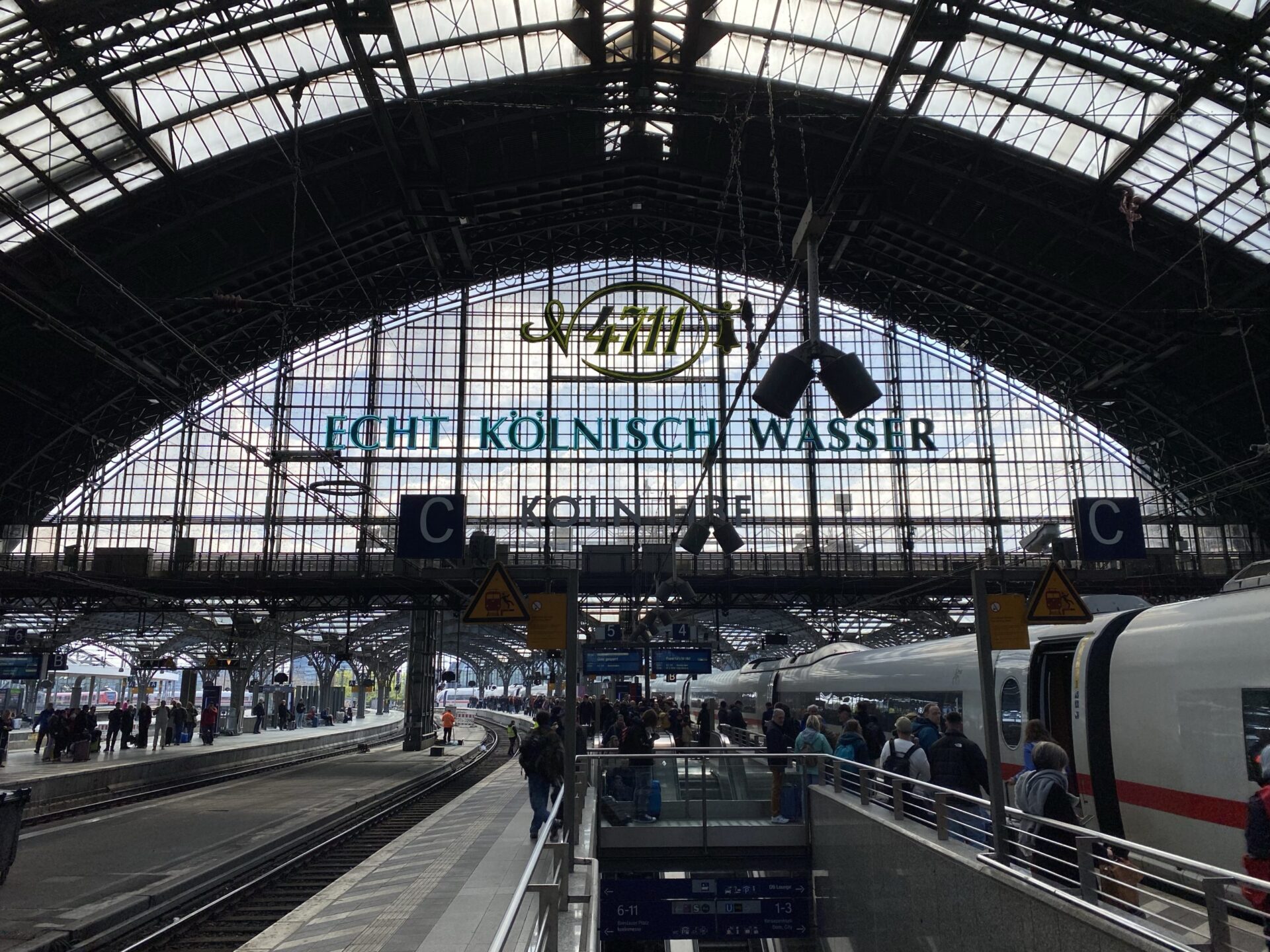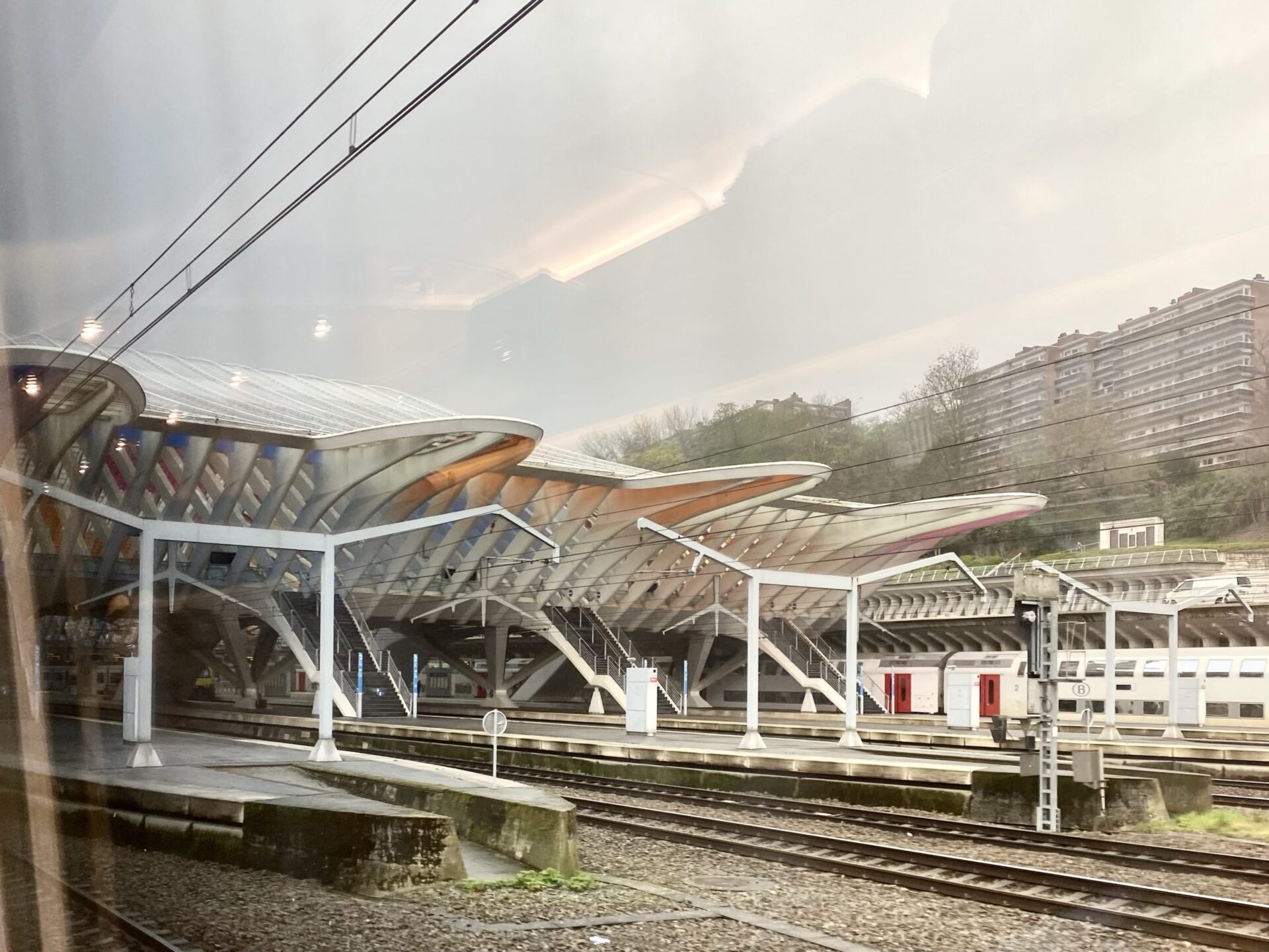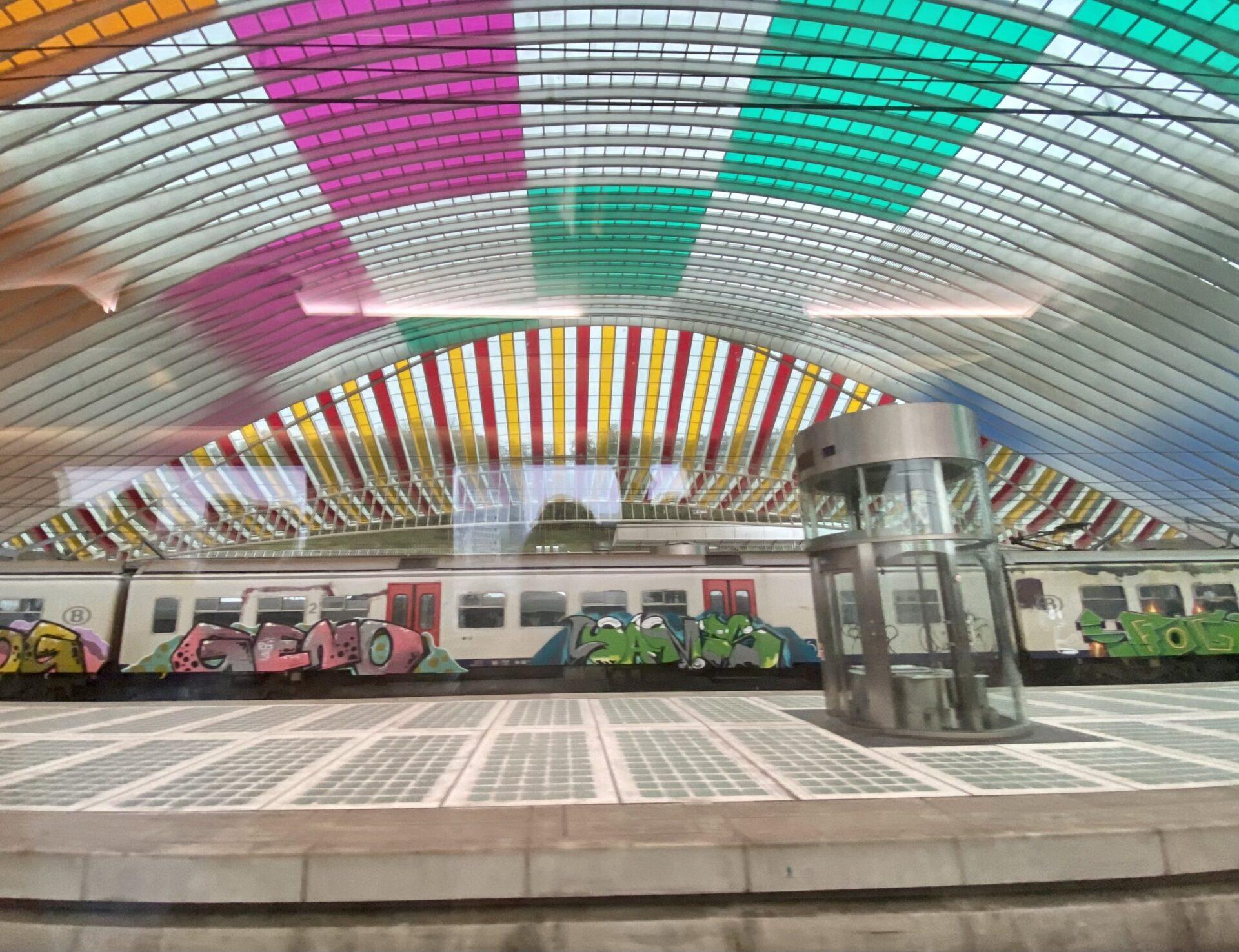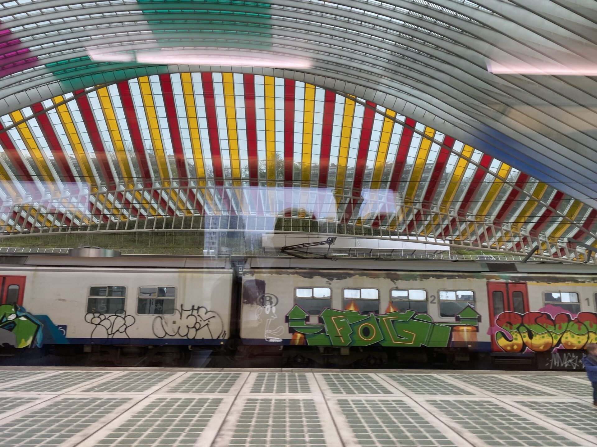 Although I’ve been through Brussels on both the previous legs of this trip, I’d not done the direct line to Cologne before. I did have some work to do, but interesting sights out of the window are always a distraction, indeed they are a key part of the trip! As we pulled into Liège, the station canopy caught my eye. Once we were inside a fabulous multicoloured roof revealed itself.