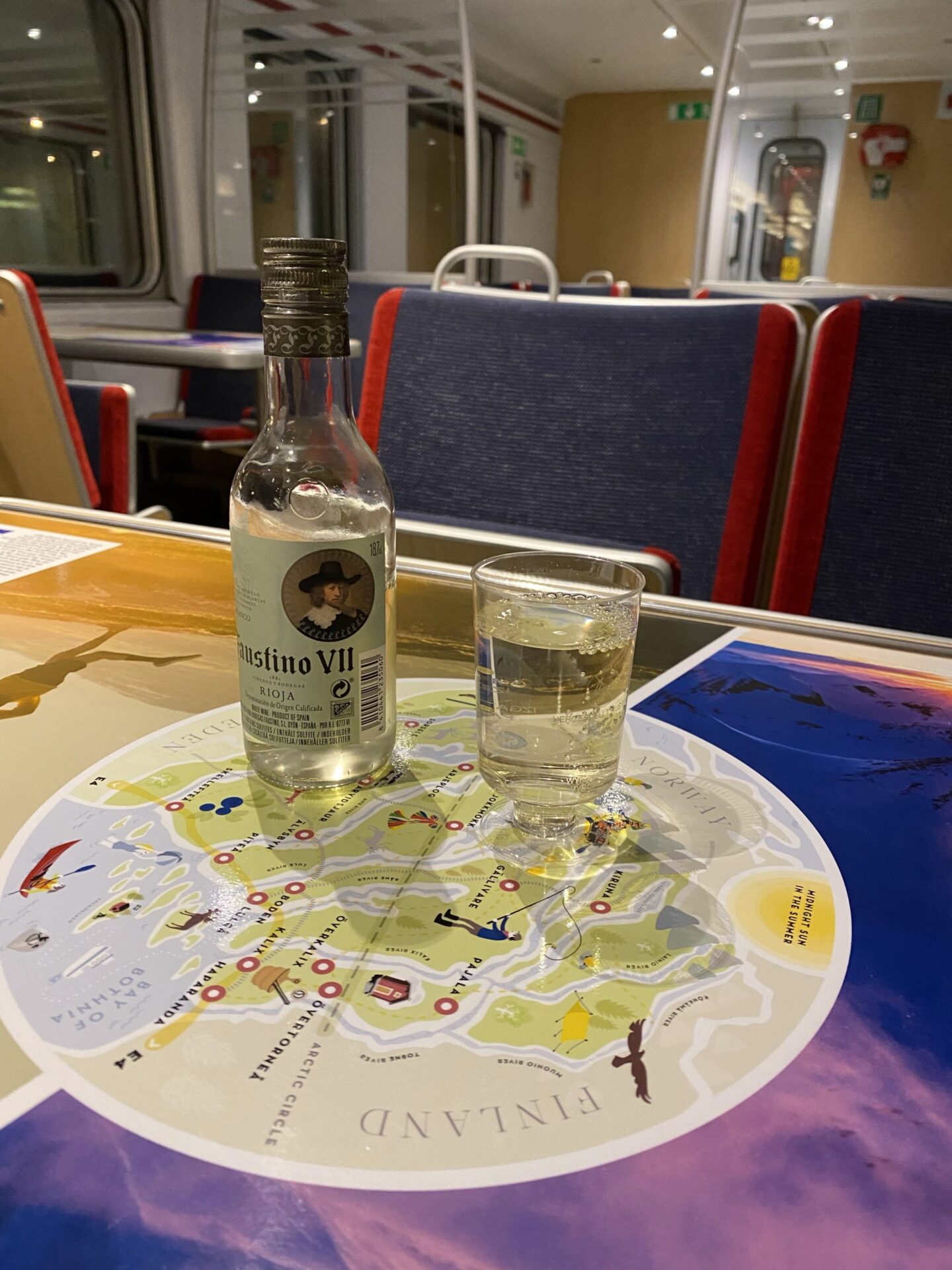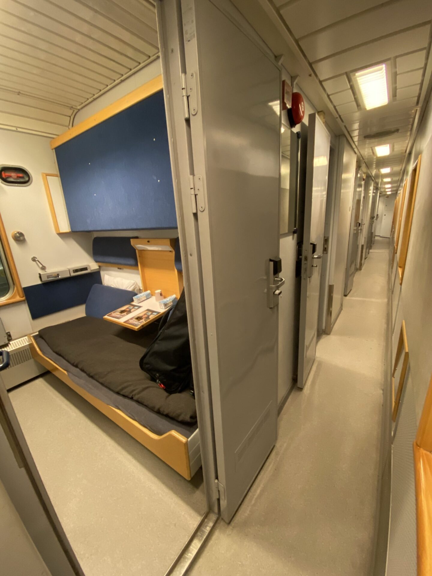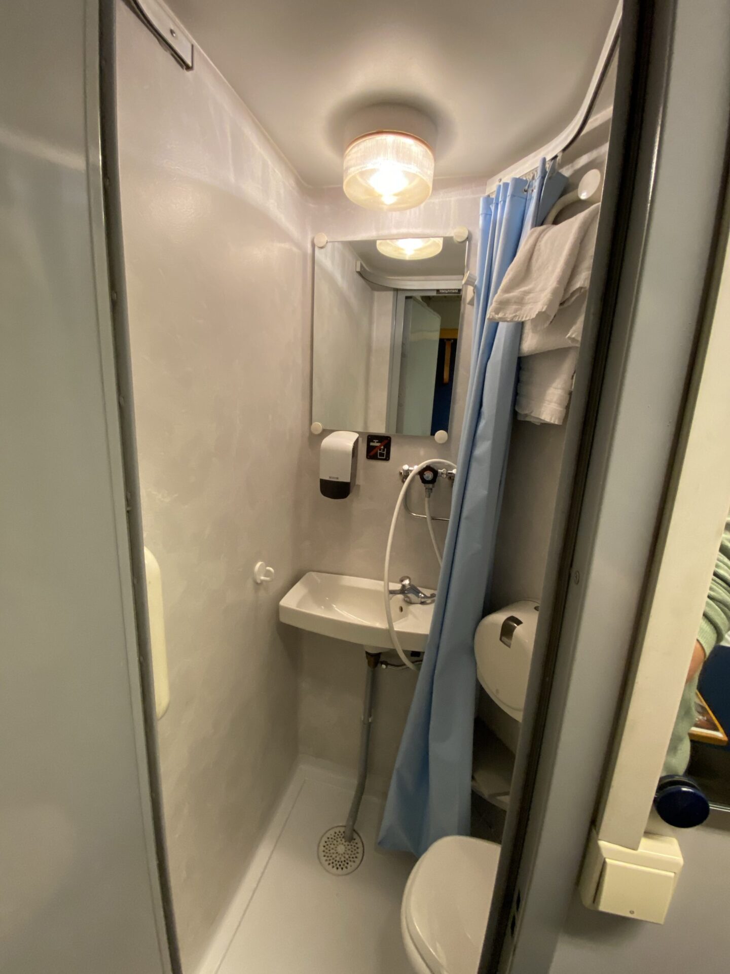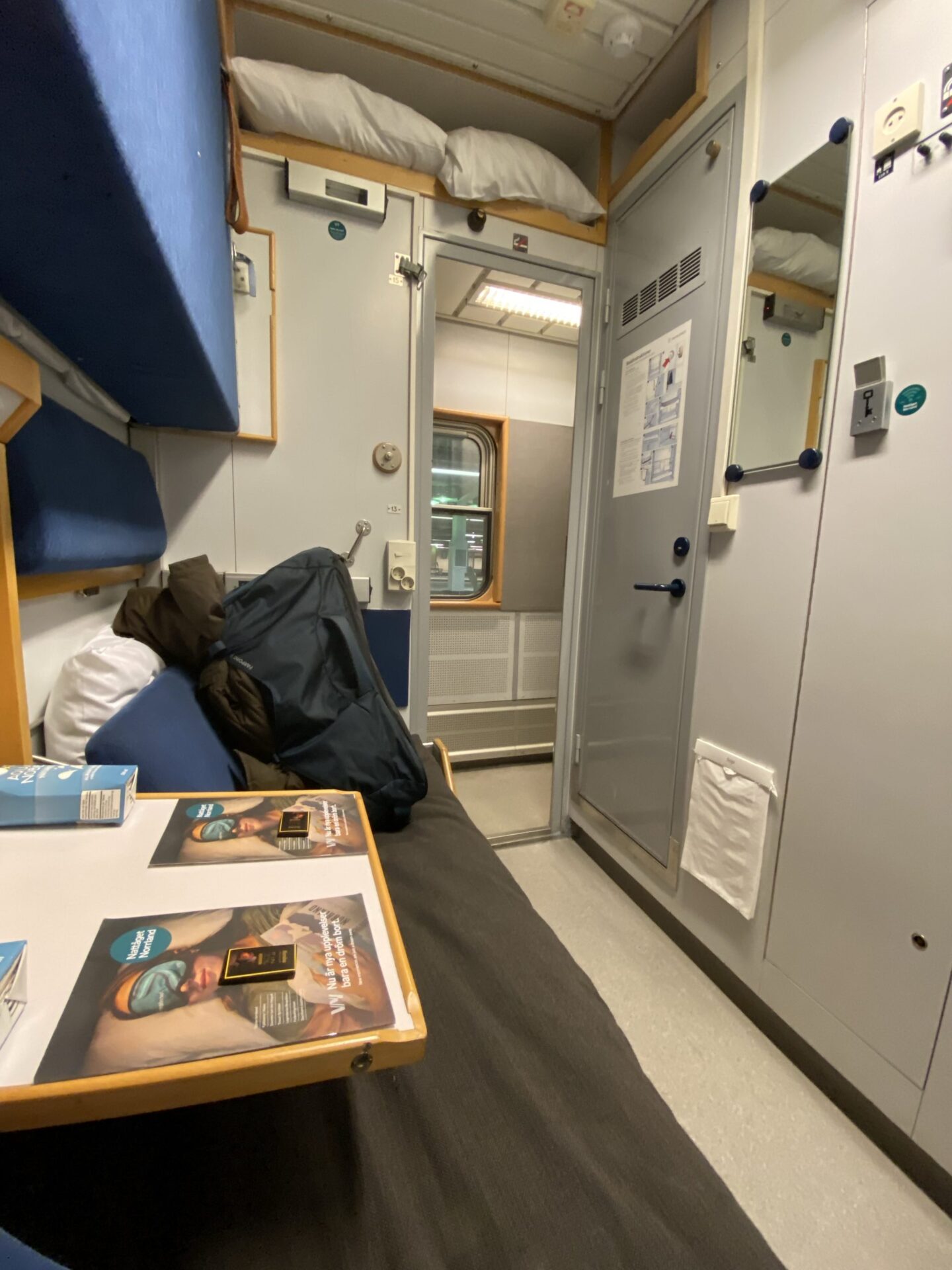 I boarded the sleeper around 9:45, for a 10pm departure. I’ve done one sleeper train before, from Frankfurt to Vienna, on the night that the UK left the EU (and I wanted to be well away from it all) but this cabin had a (tiny) en suite, making it significantly more luxurious than my previous experience. It’s a shame that they look spartan as they’re actually quite cosy and well thought out. I dropped my bags, checked in with the attendant and went to the restaurant car for a late evening glass of wine. There were only a handful of other people in there.
