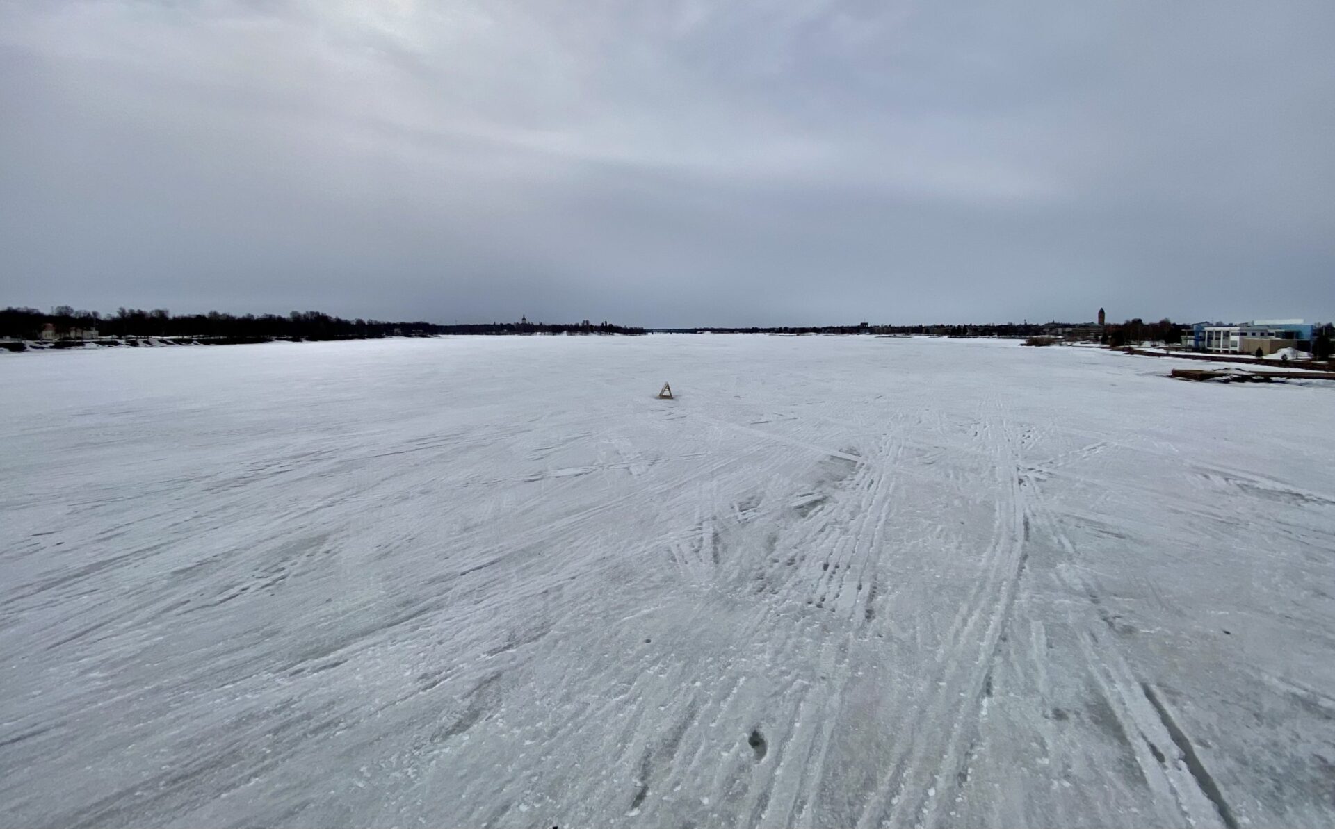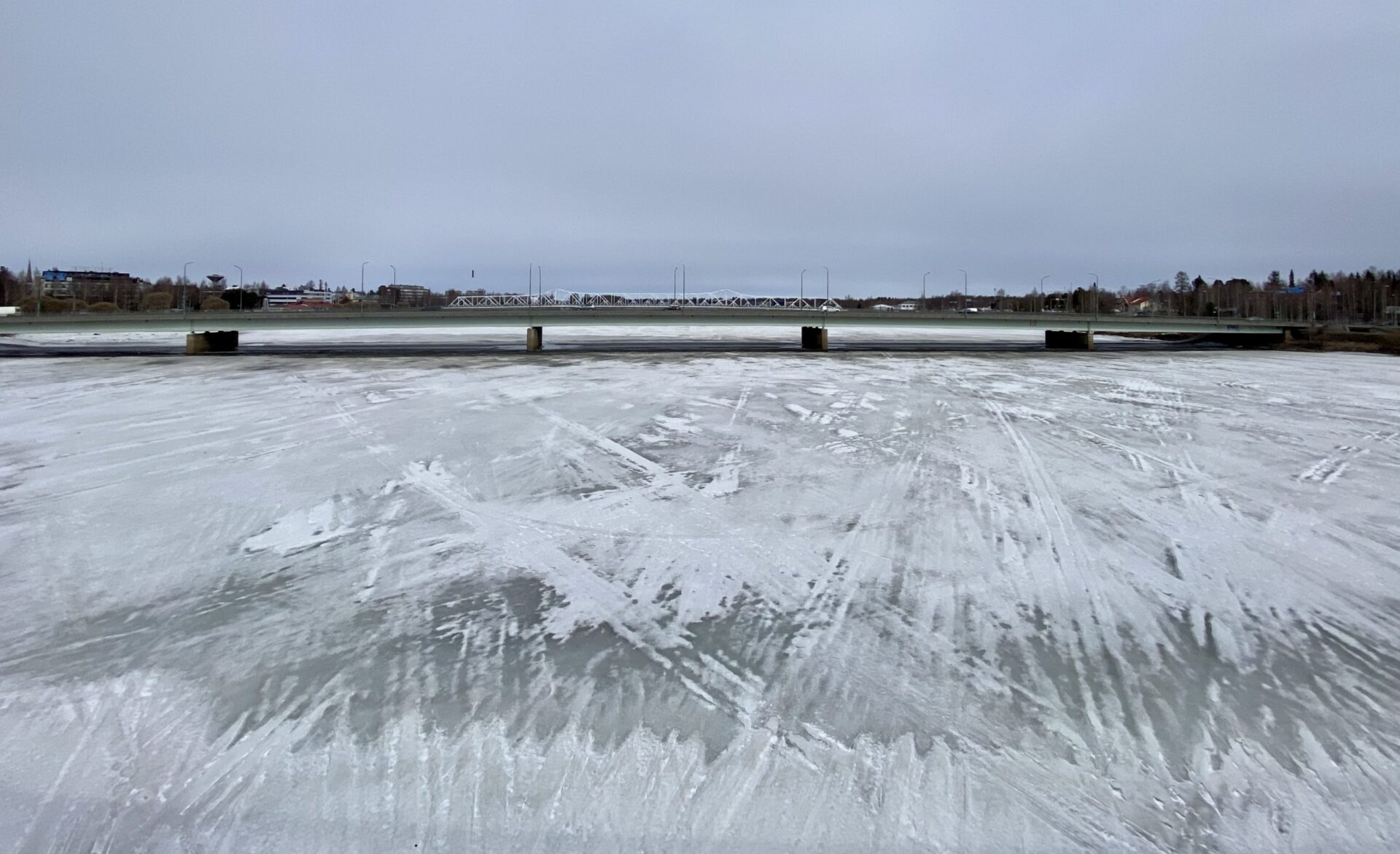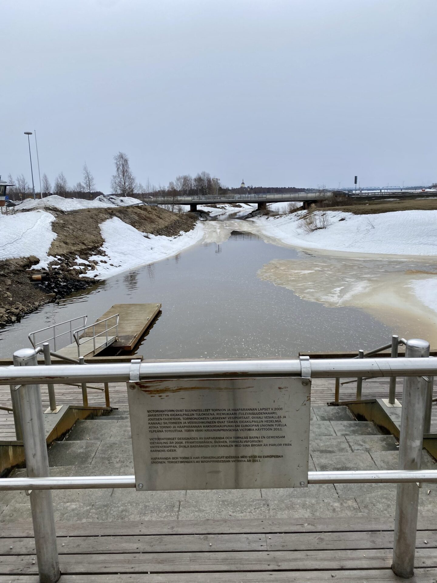 The border runs along the line of a small side stream of the much larger Torne River, which I crossed on a footbridge. The main river was completely frozen over and the local Lions had for some reason put a noticeboard onto the ice in the middle of the river.