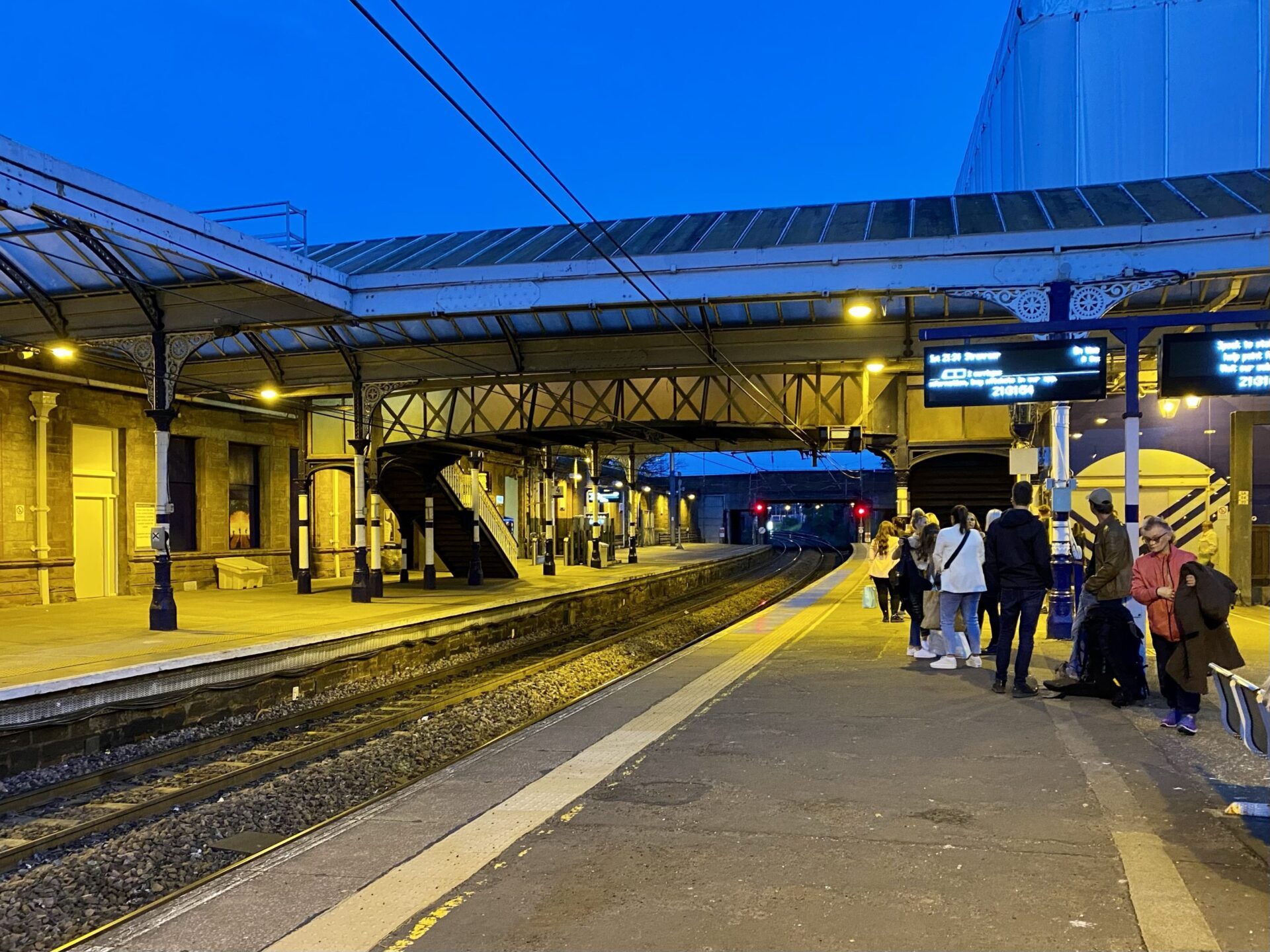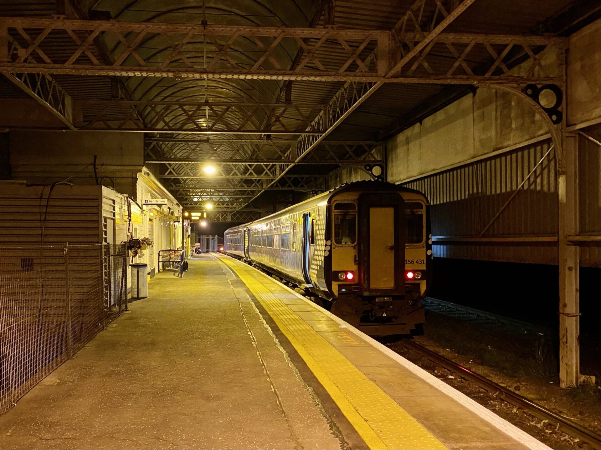 I sat on a bench on the platform to do my work as there was no indoor/covered space. Thankfully it had by now turned into a lovely evening. By the time my train arrived, it was almost dark and the platform was quite busy. The final journey to Stranraer was unremarkable, but the station, set inside a shed on a man-made promontory, where ferries used to land directly alongside, was a quirky end to the day.