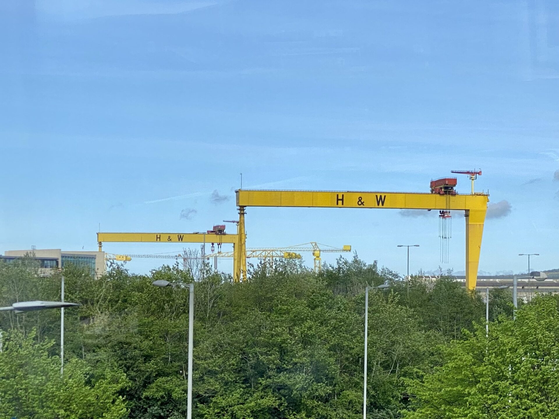 The run in from Larne to Belfast is rather pleasant. You head along the edge of Larne Lough, then after a short inland section emerge onto the coast at Whitehead. I got a momentary (an unexpected) glimpse of the railway museum there; enough to make me think it would be worth a look when I’m next in this part of the world in September. As you approach Belfast, the iconic H&W cranes are the first visible landmark, from over 10 miles away. As you enter the city they dominate the skyline.