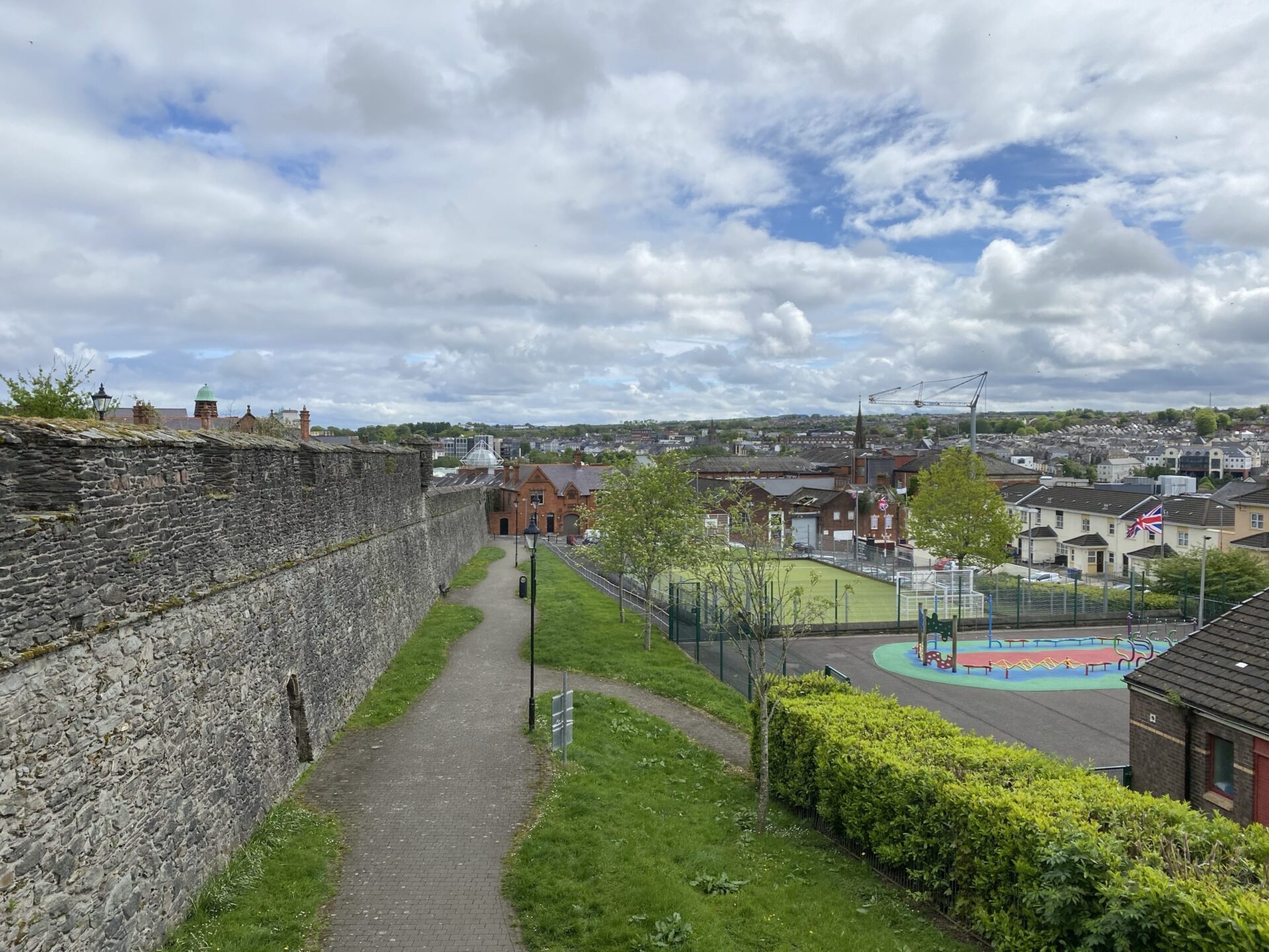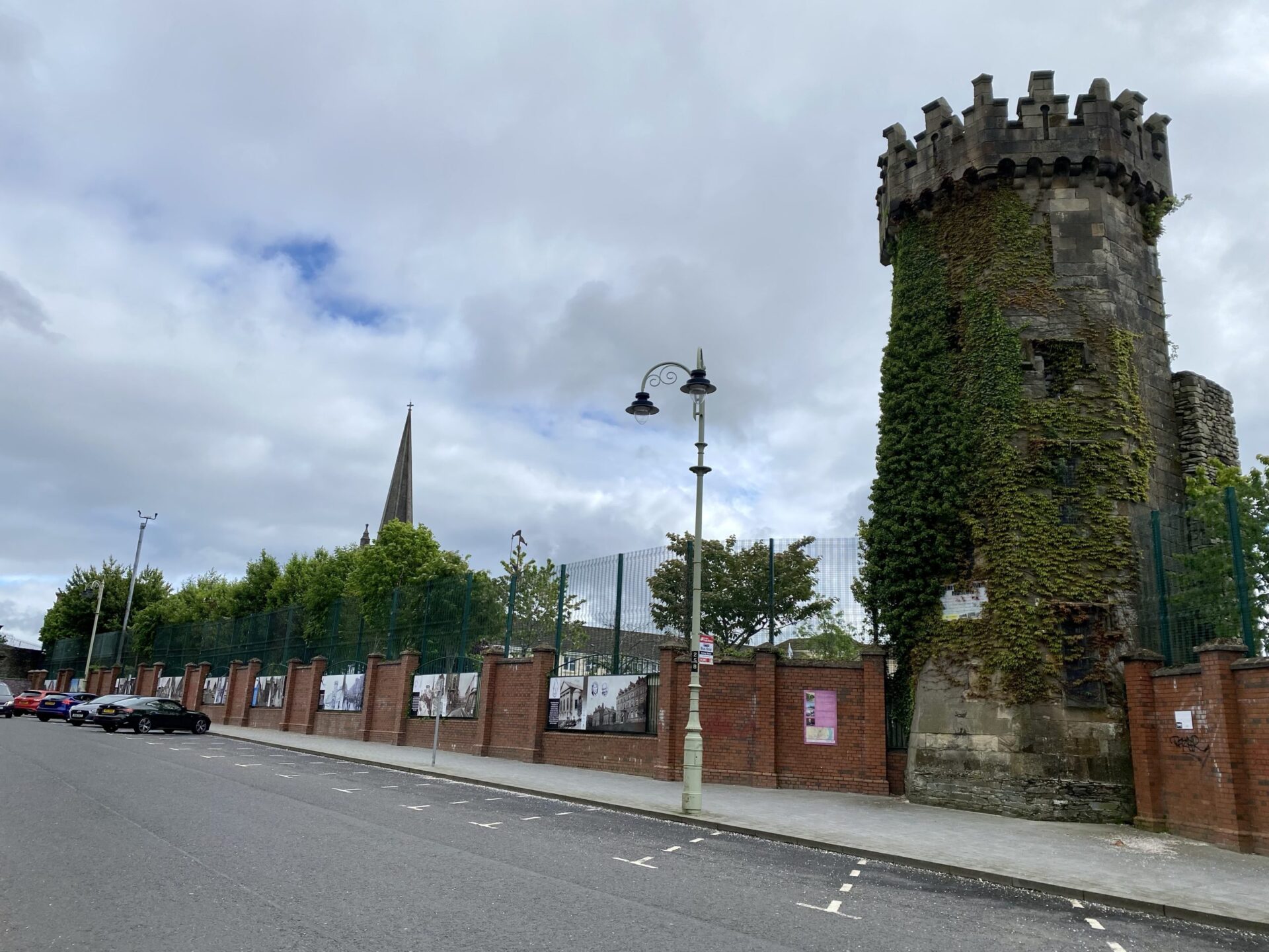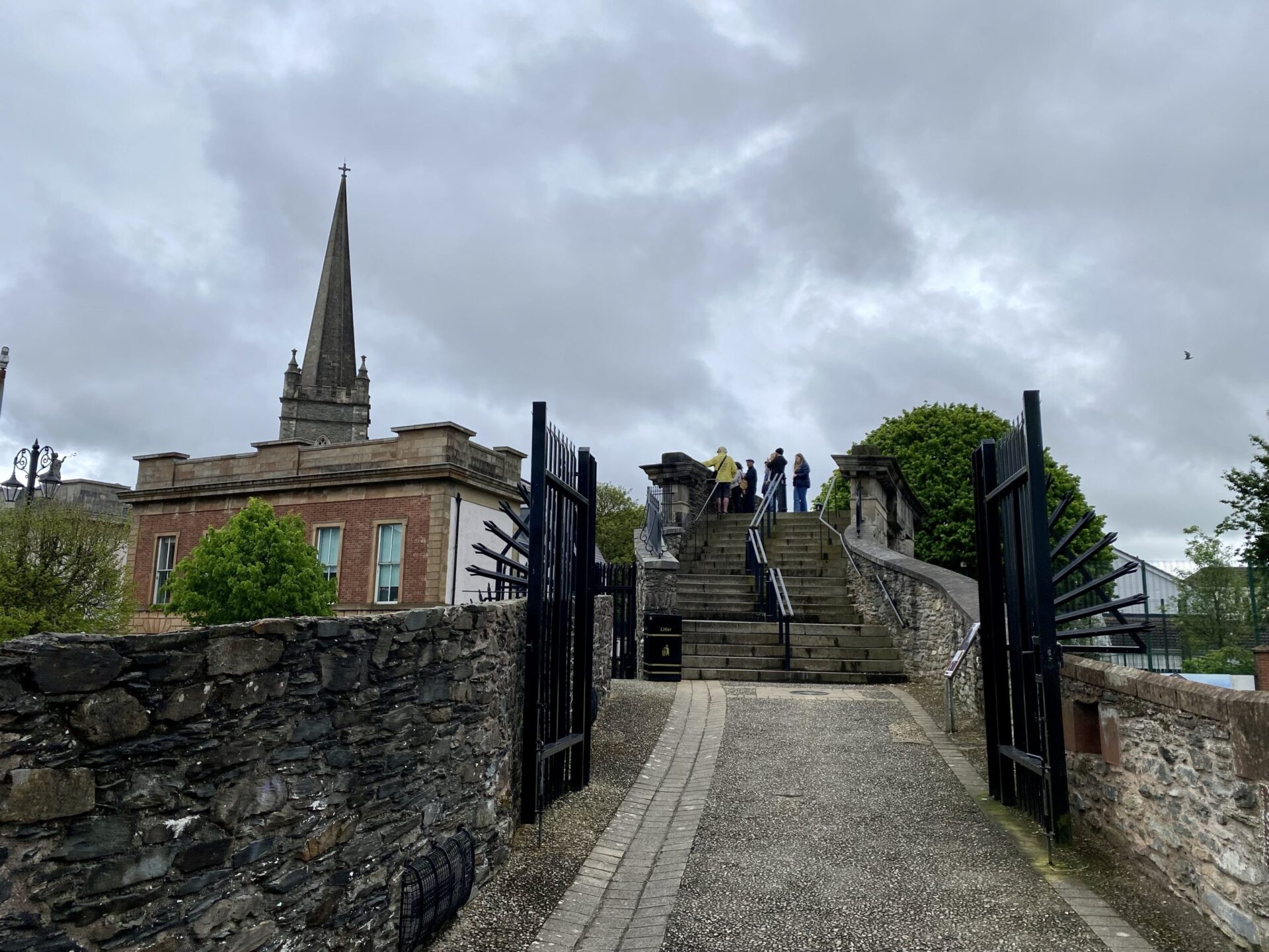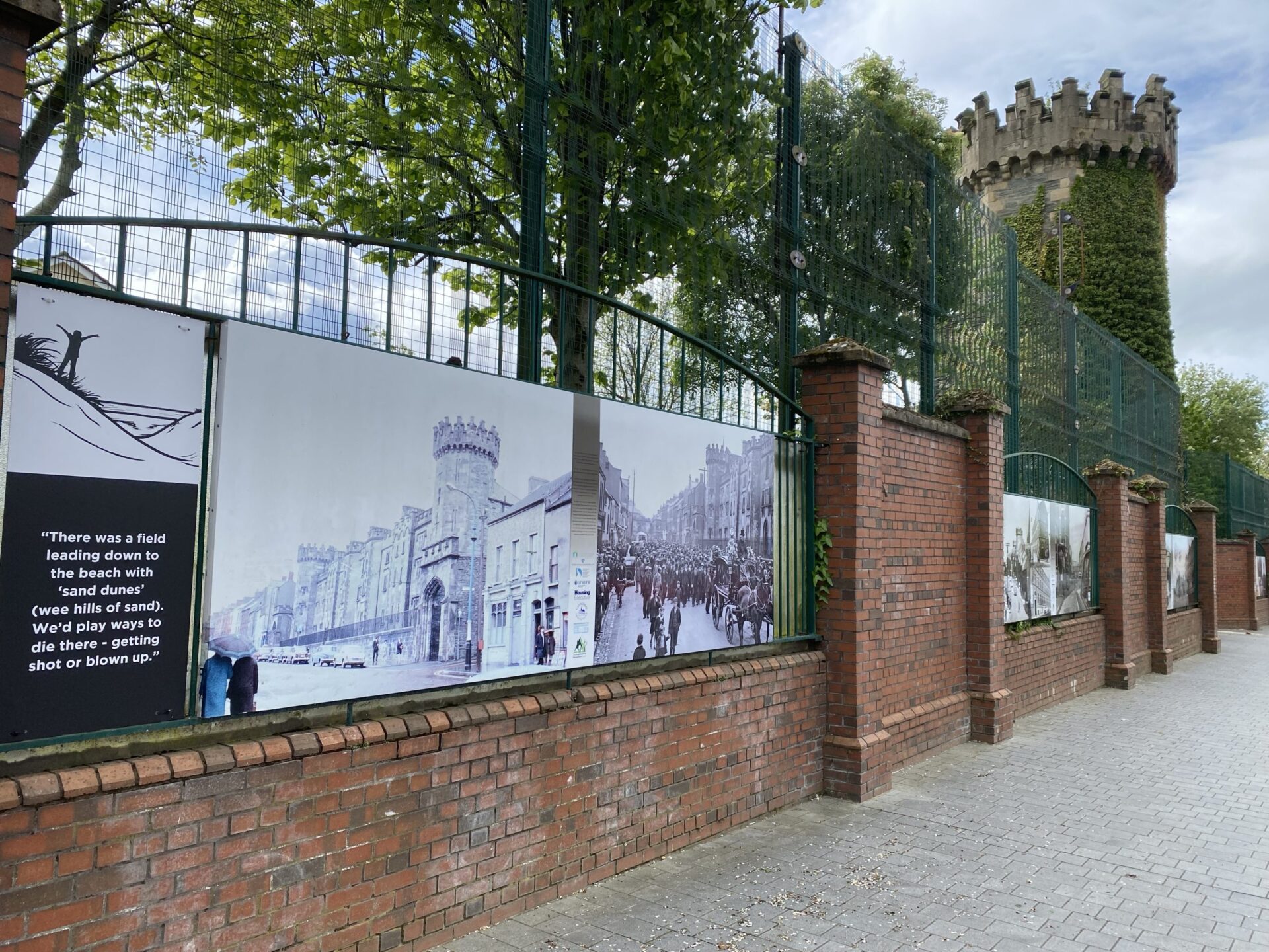 I passed the Apprentice Boys Memorial Hall. Here there is a high fence on the outside of the wall, and it is an area where the land has been cleared and grassed. One thing I admire about this city is it’s not afraid to tell it’s difficult stories. There are boards all over the place and I learned a lot from them, not least in this area.