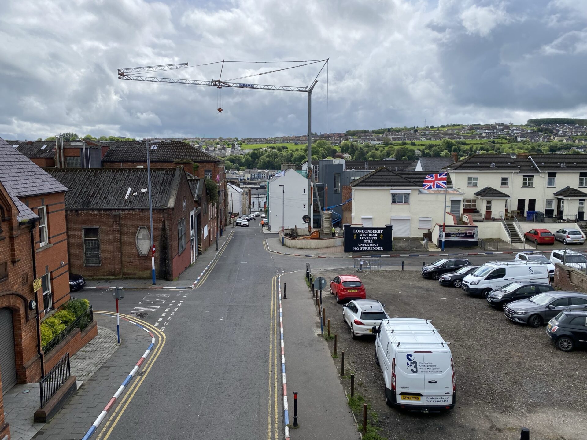 Having turned the third corner I was heading downhill again. This section of the wall overlooks strongly loyalist areas, as can be seen from the flags and graffiti, and painted kerbstones, similar to those I’d seen last night.