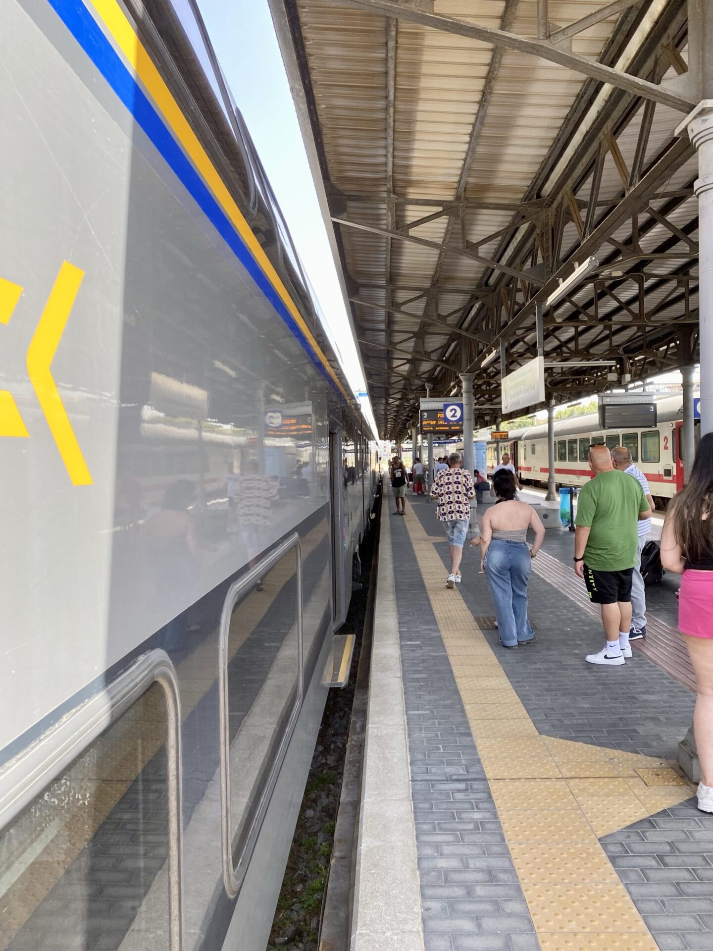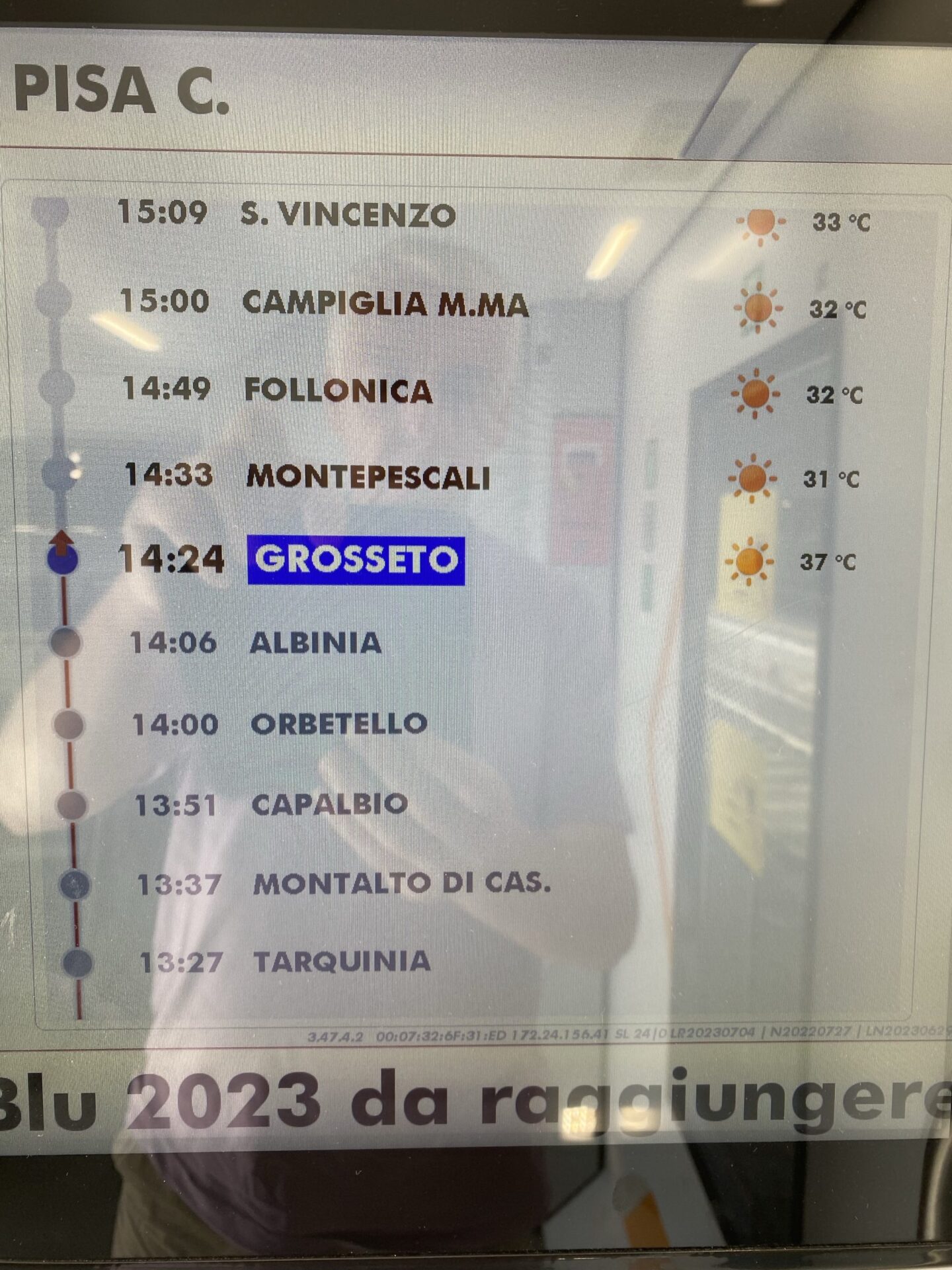 The train had been running late throughout it’s journey, and by the time we arrived in Grosseto, was about 15 minutes behind schedule. We were told that there would be a further 10 minute delay due to a technical problem. The power went off on the train, but fortunately the doors had been opened. I say fortunately, they were letting very hot air in. The display on the train said 37°C (i.e. body temperature, 98.6°F) just before the power was switched off but at least it was circulating, which was marginally less unpleasant. Lots of people got off, some went to the concourse to get drinks.