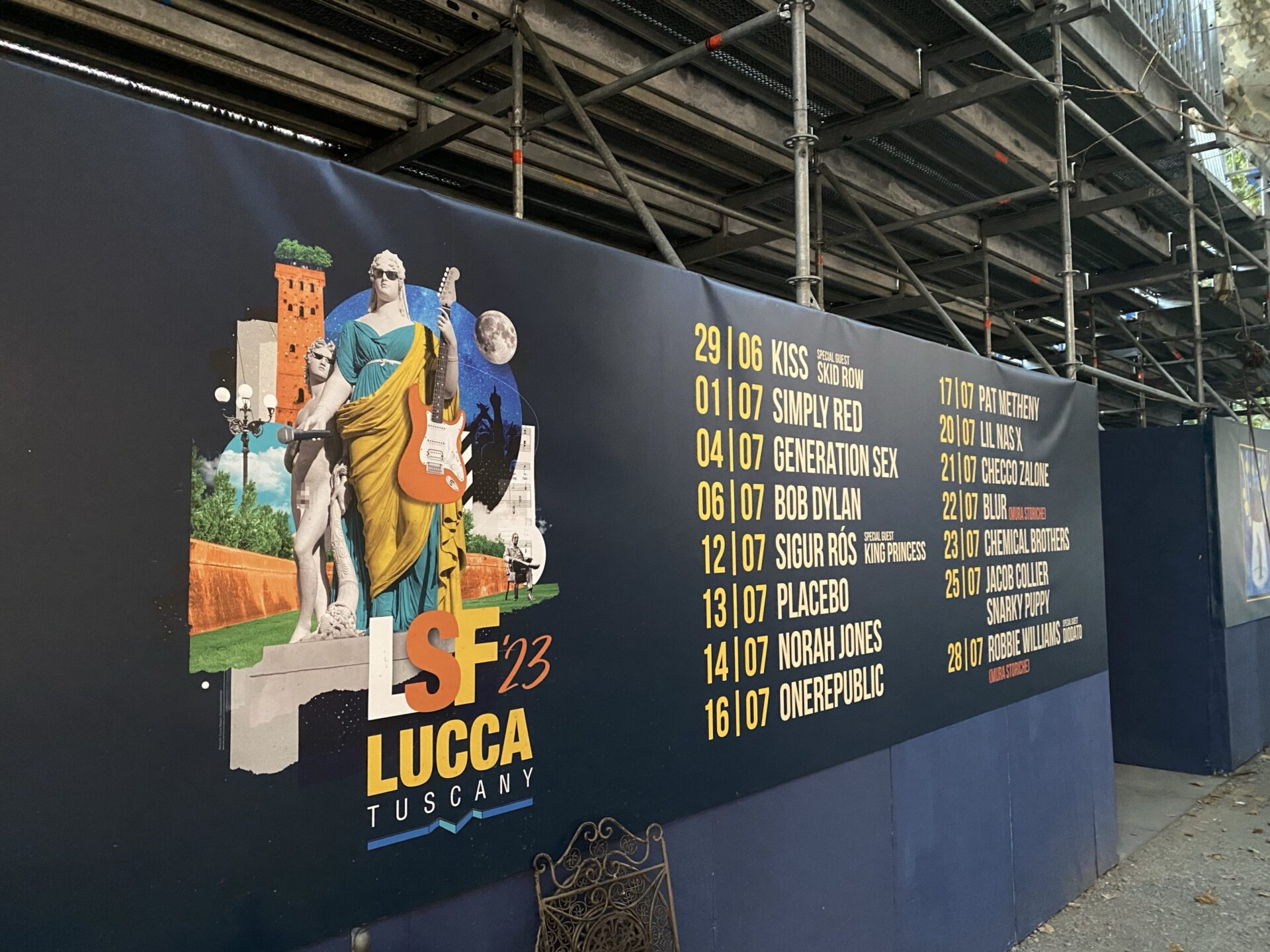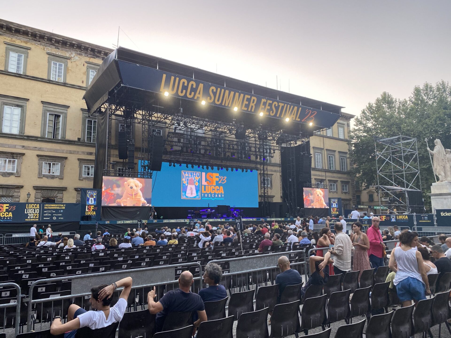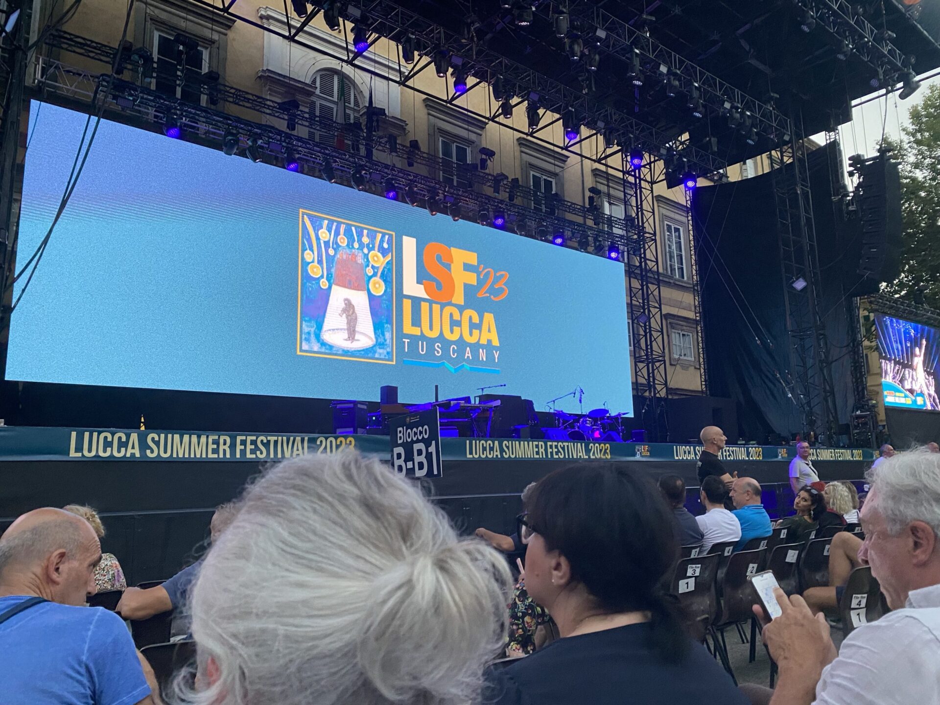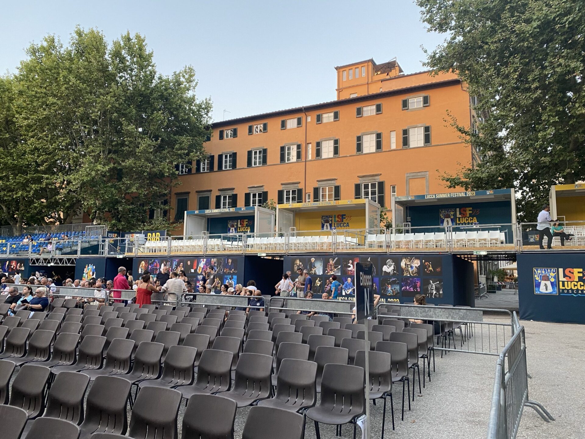 It turned out that I could have gone straight in, the section inside the perimeter had any number of restaurants bars and cafés. The stage was a huge construction, and the seating area had a grandstand as well as the flat seating in the square. I’d not realised that what I thought was a one-off show was actually part of a festival with artists as diverse as Kiss, Bob Dylan, Blur and Simply Red over a few weeks, mostly in this arena, but with a couple of the larger shows outside the city walls.