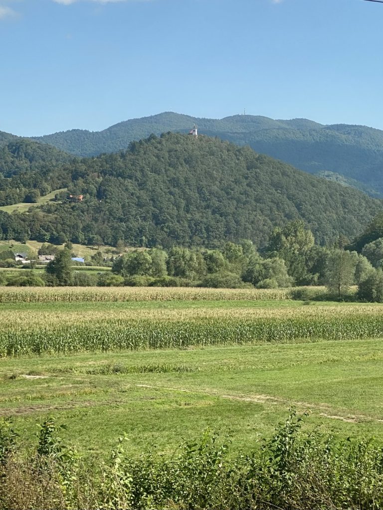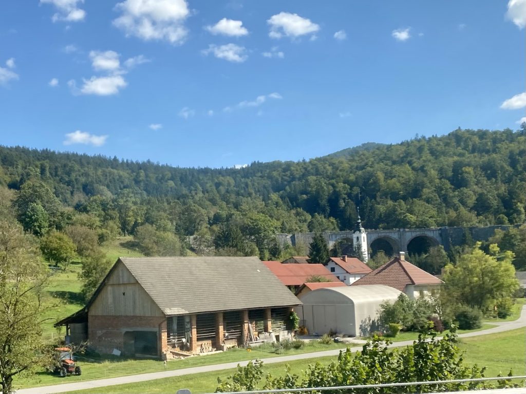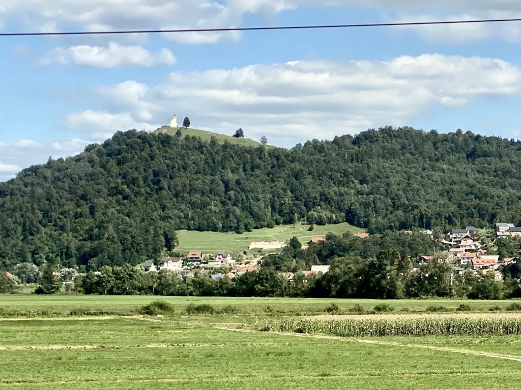 The border into Slovenia is passed almost immediately as we leave Opicina. The scenery from here is all hilly, often woodland and immediately feels different to Italy. It opens out a little and becomes a wide plain as Ljubljana is reached, with towers on various hilltops at the edges of the plain.