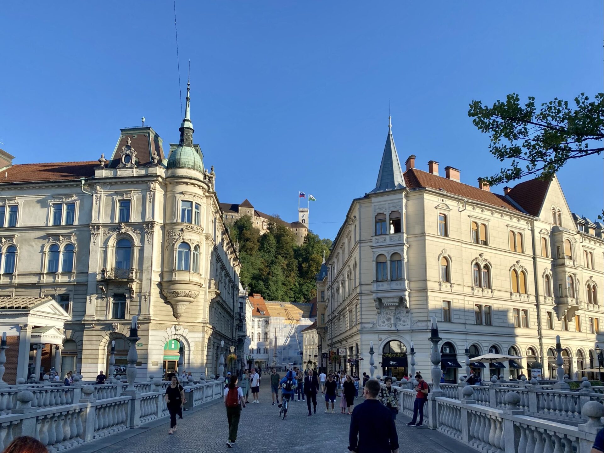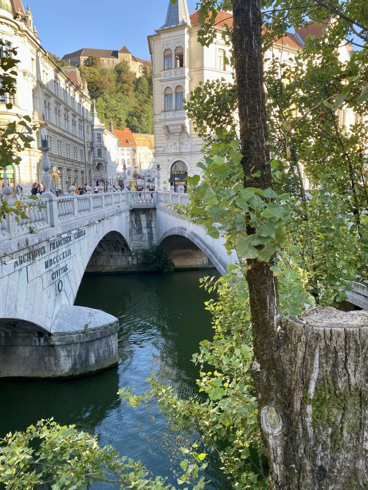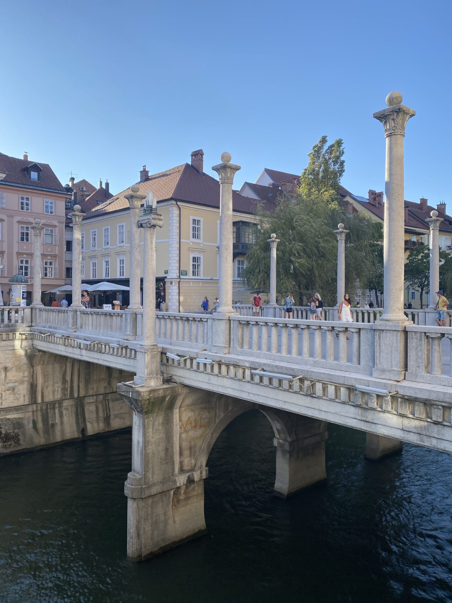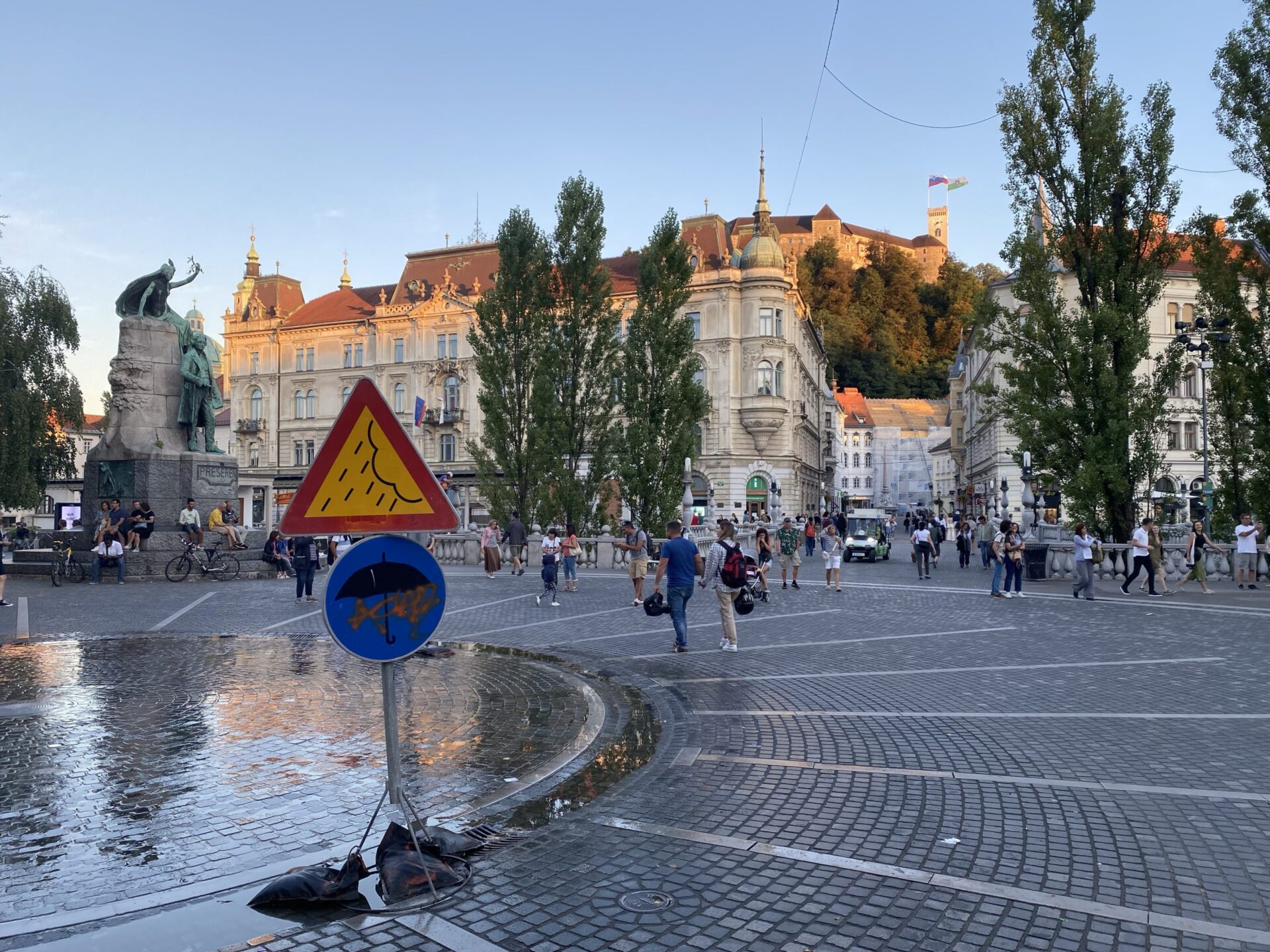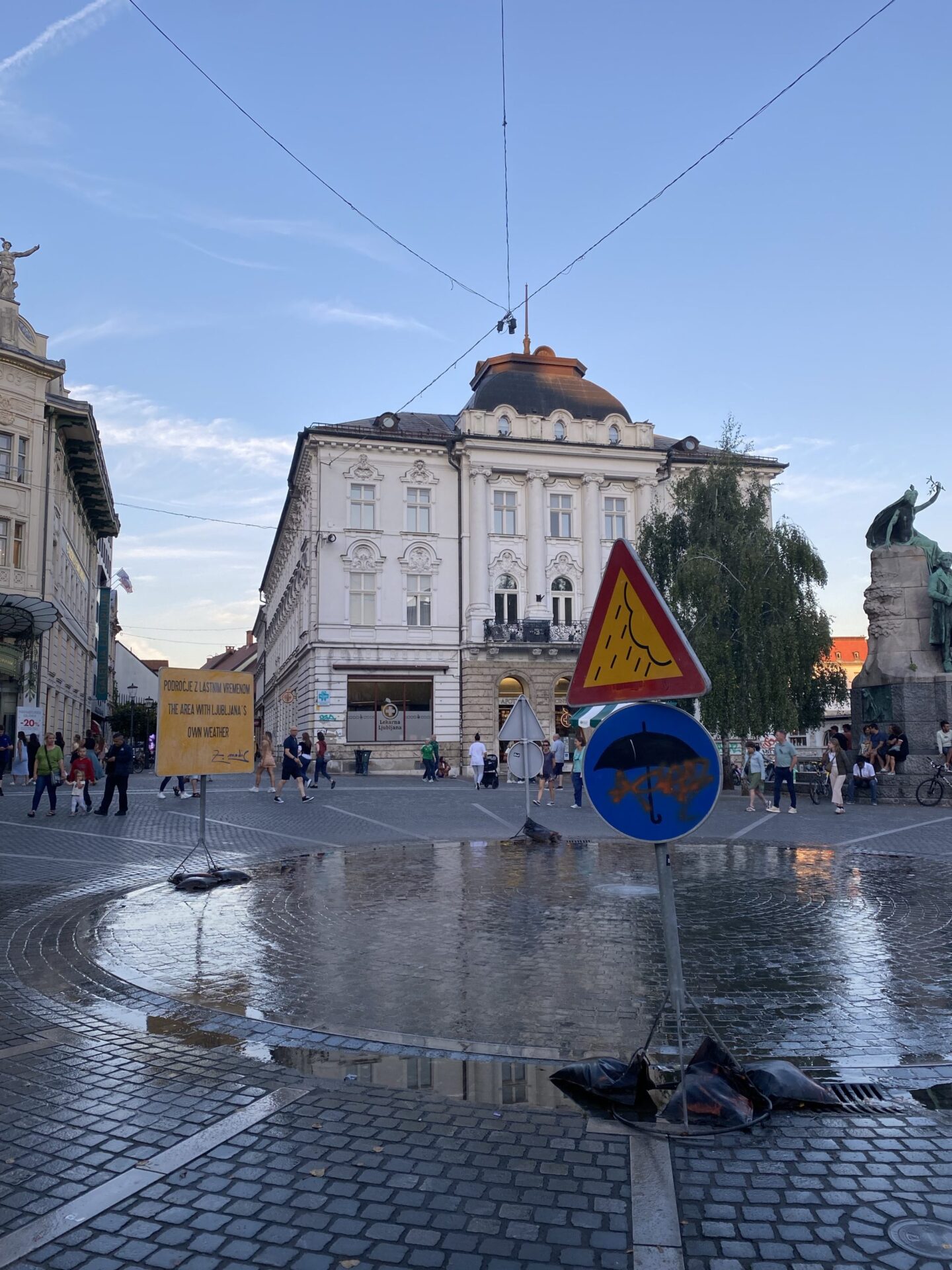The focus of much of the city is the river. There are cafes and public spaces all along it. The main square is right next to the river and has a very unusual triple bridge spanning the river. in the square there was an amusing artwork creating a small rainy area in the middle of a sunny city. It was nicely done and I imagine would have been very popular earlier in the day!