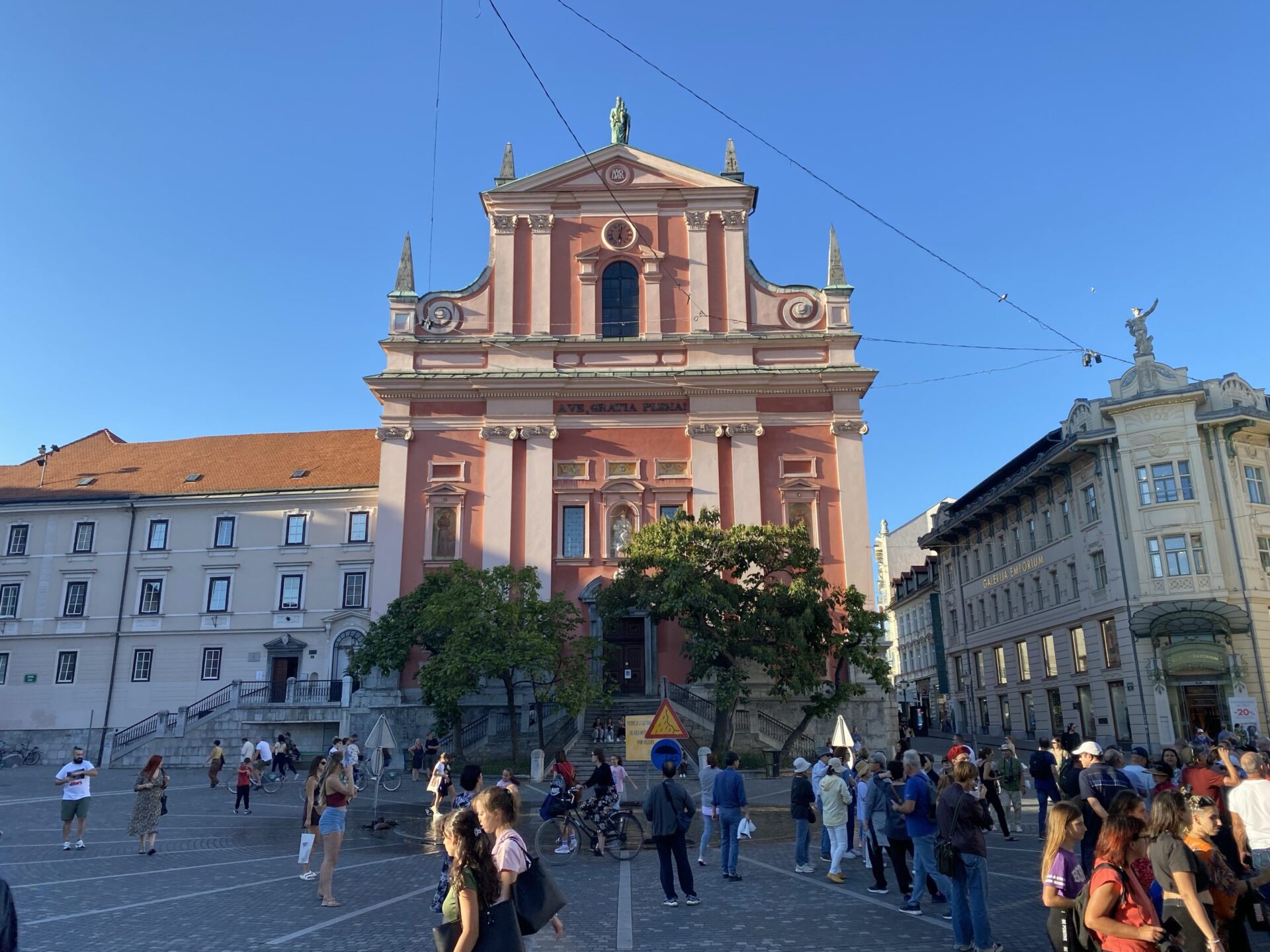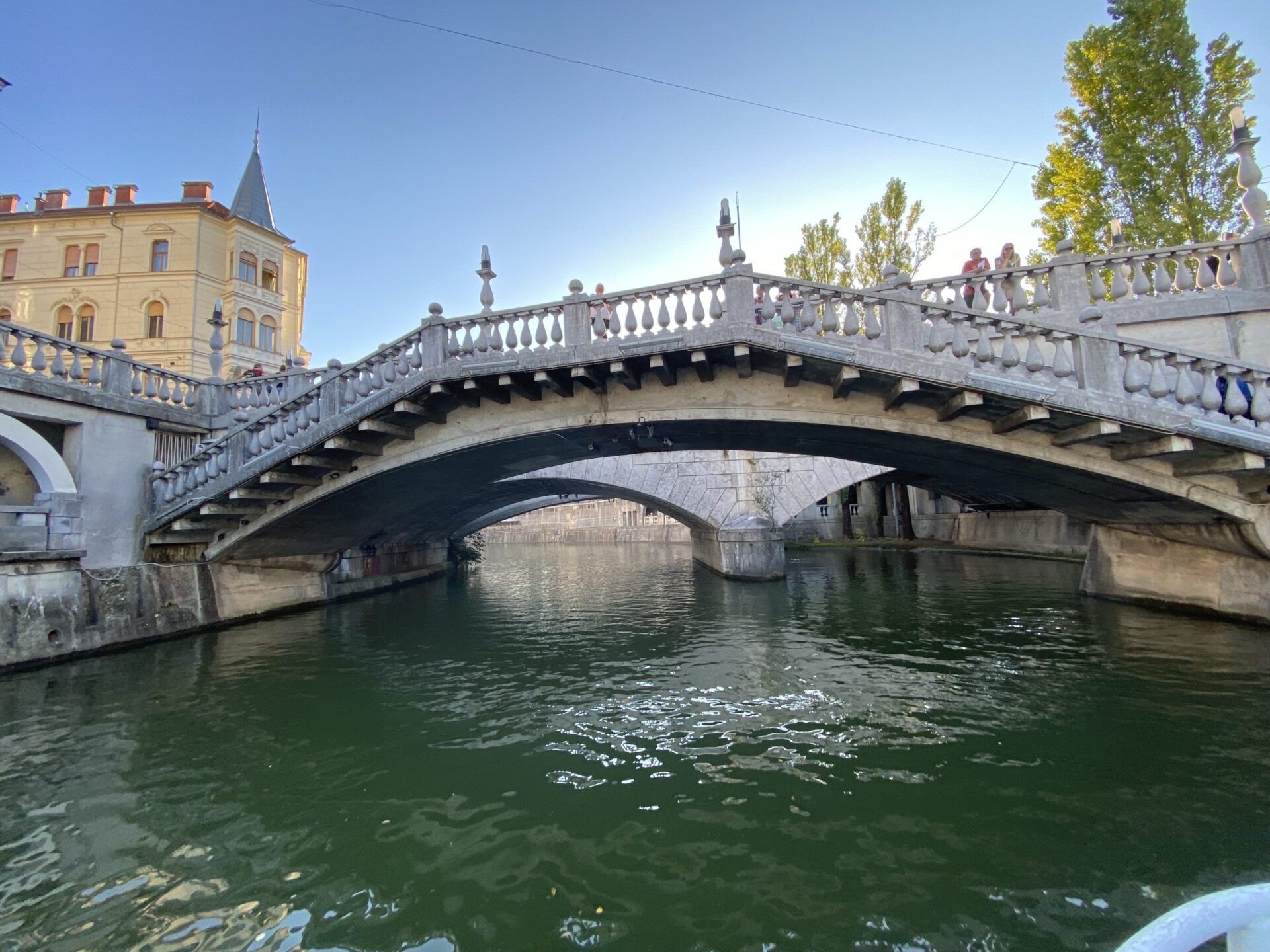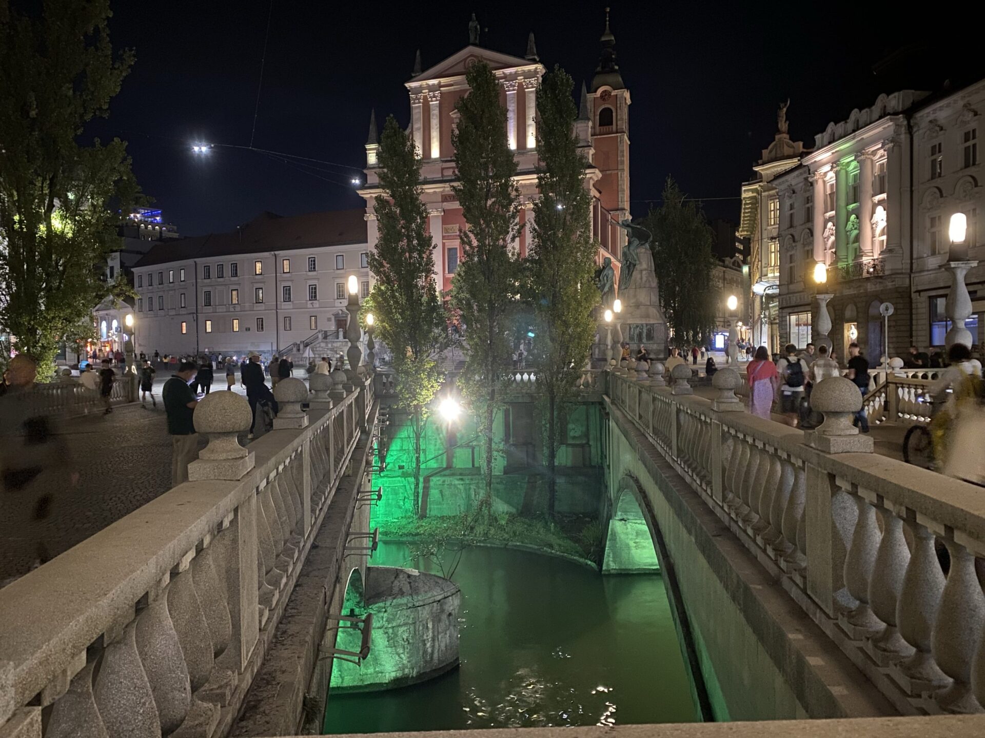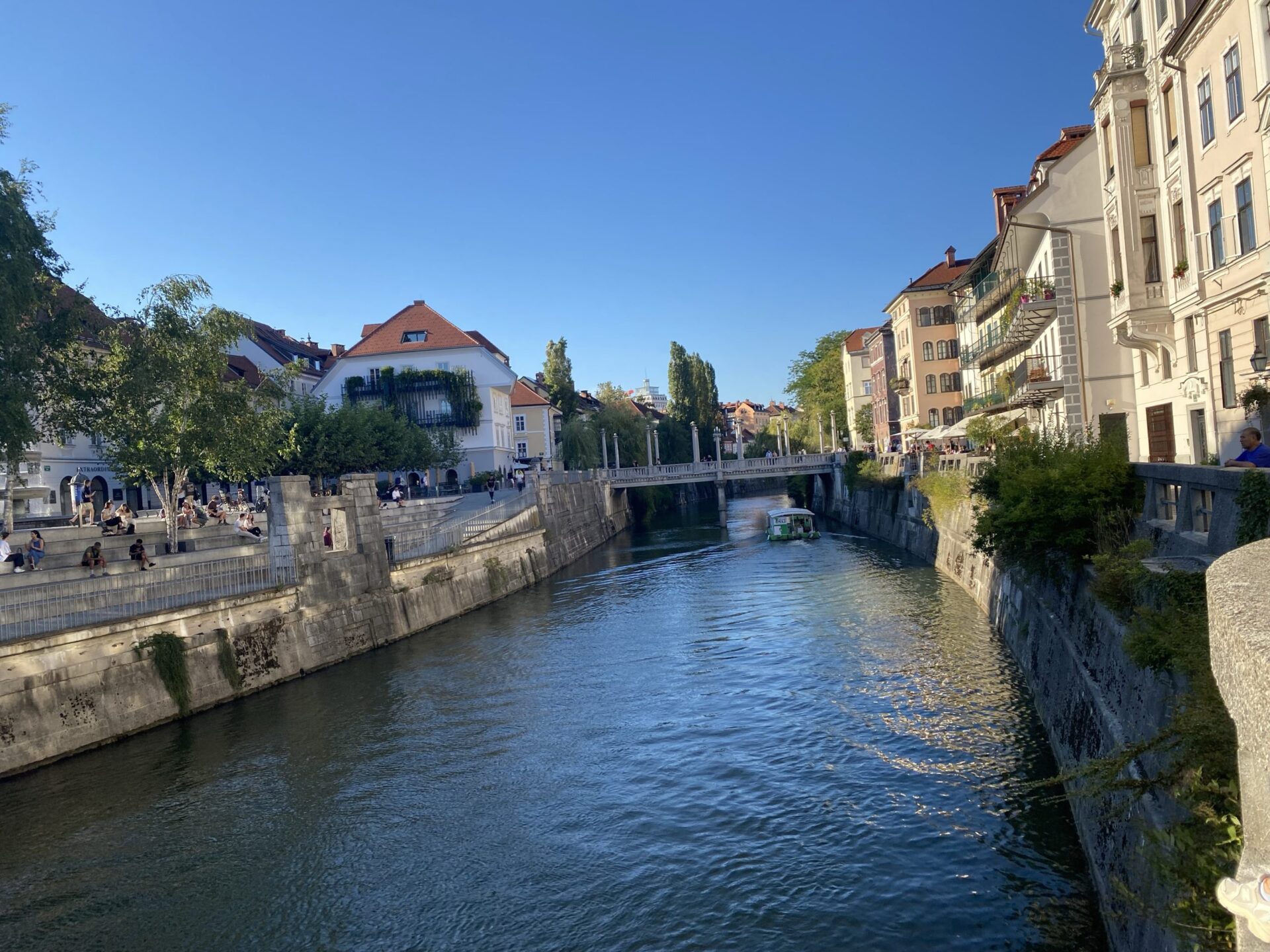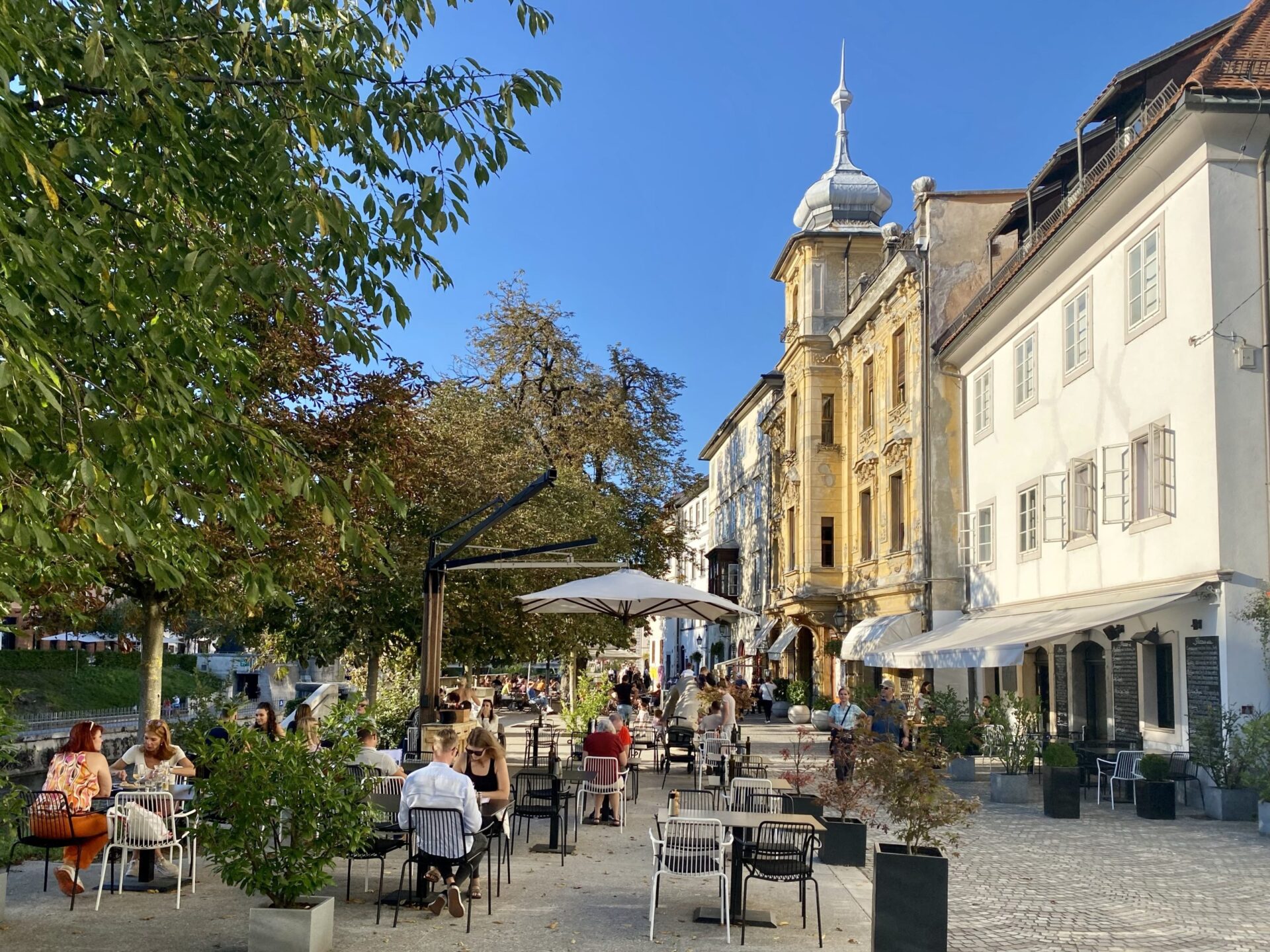 The focus of much of the city is the river. There are cafes and public spaces all along it. The main square is right next to the river and has a very unusual triple bridge spanning the river. in the square there was an amusing artwork creating a small rainy area in the middle of a sunny city. It was nicely done and I imagine would have been very popular earlier in the day!