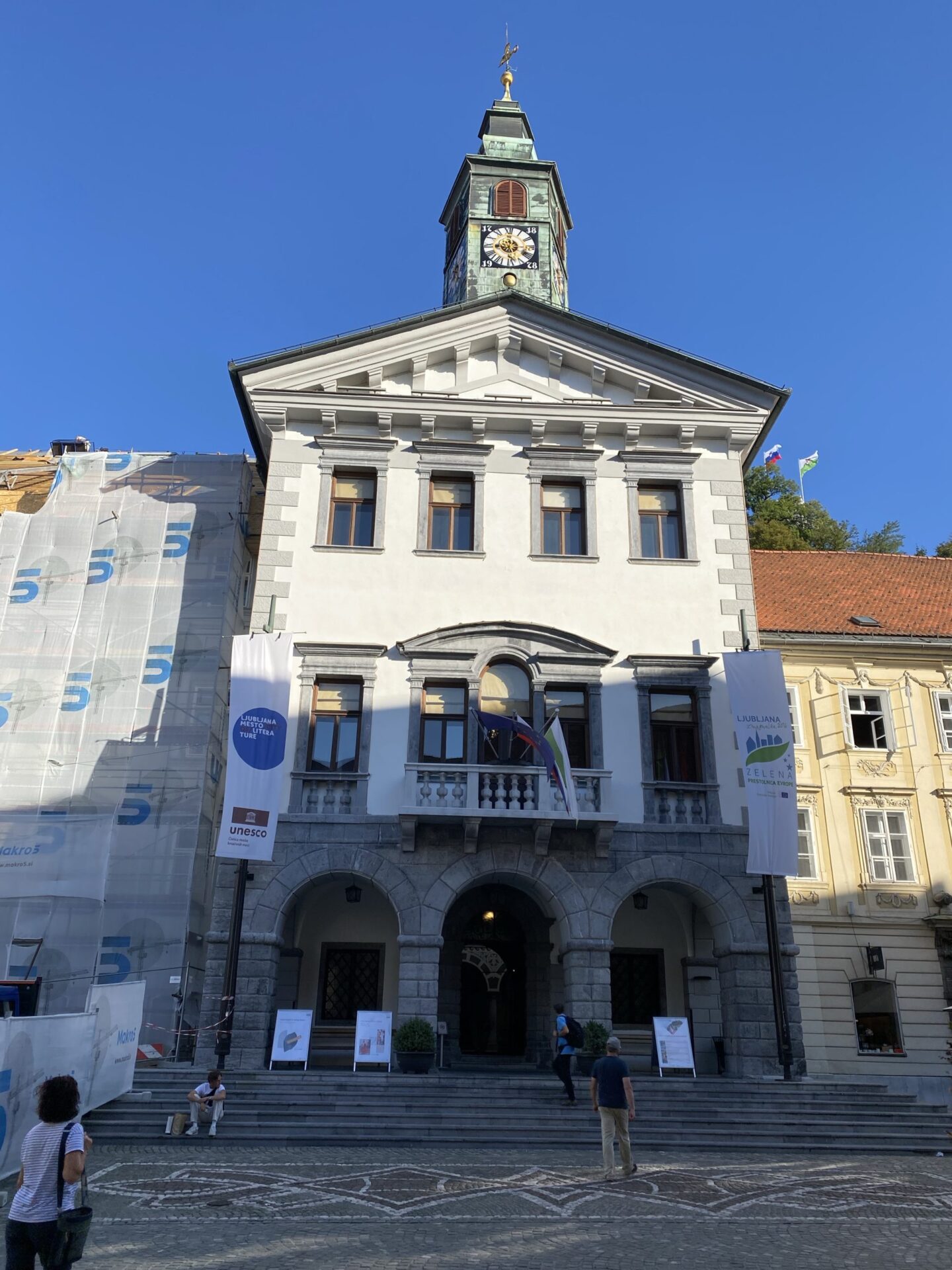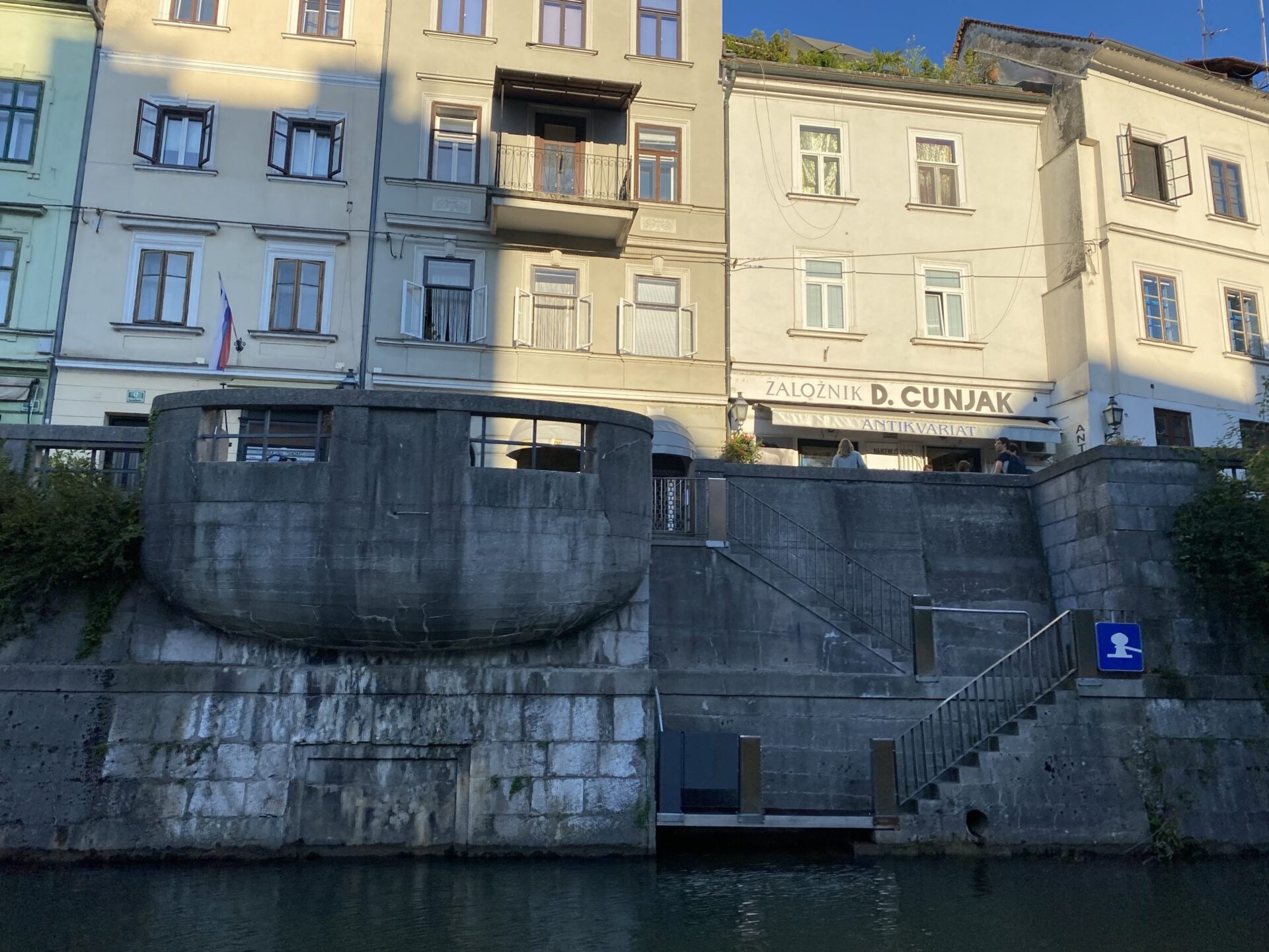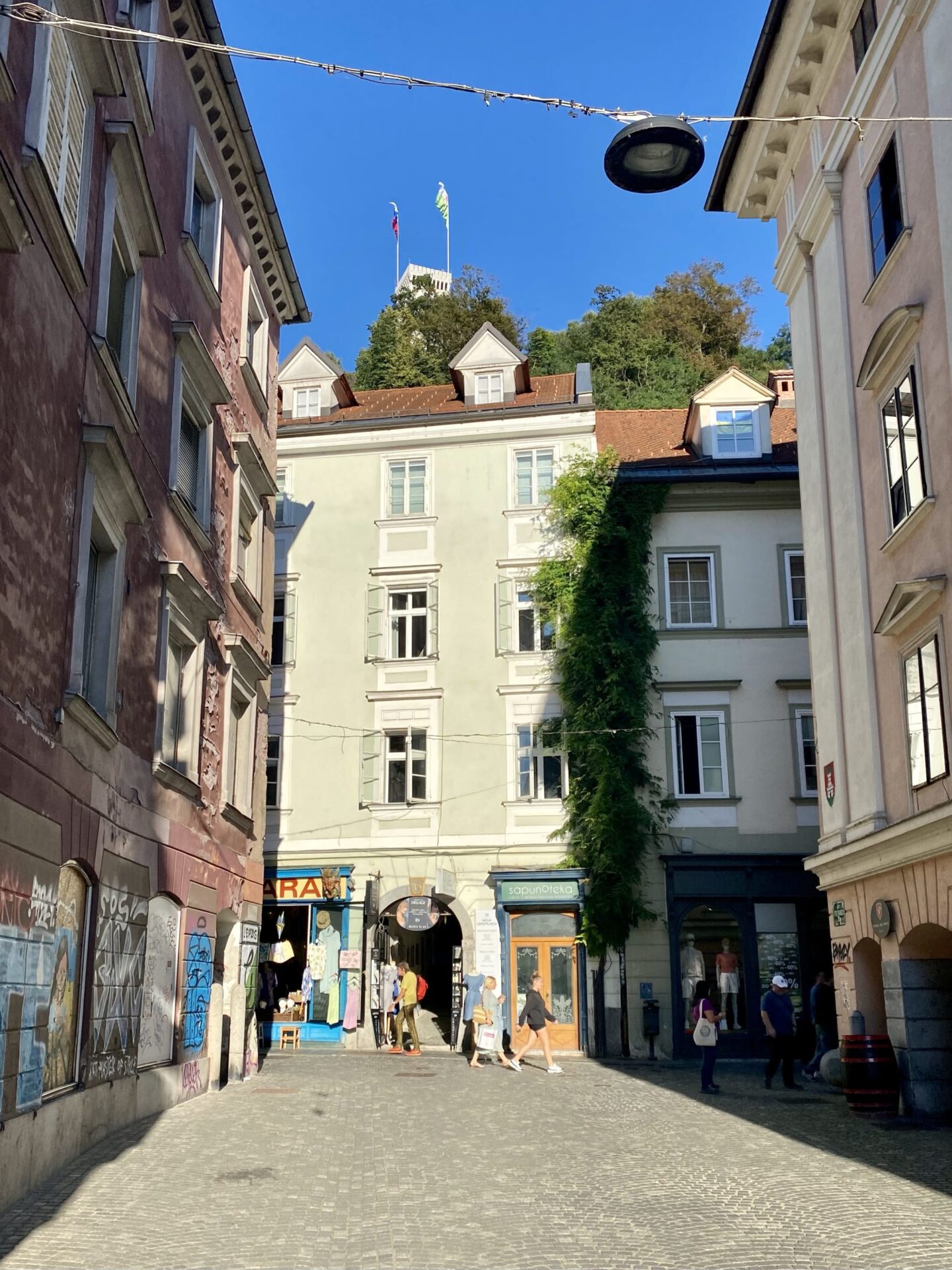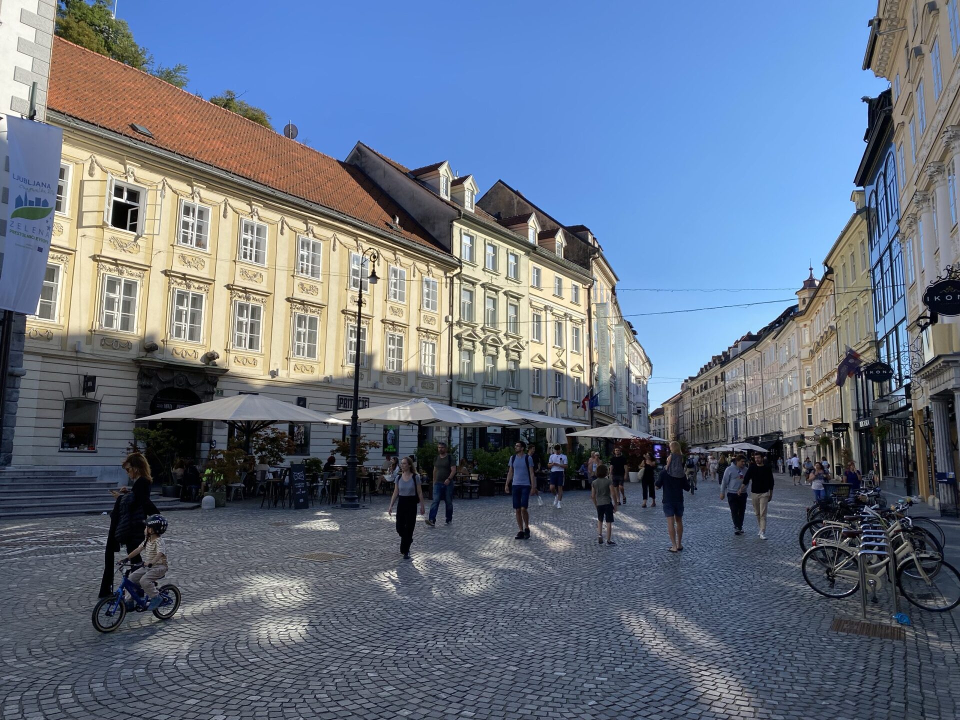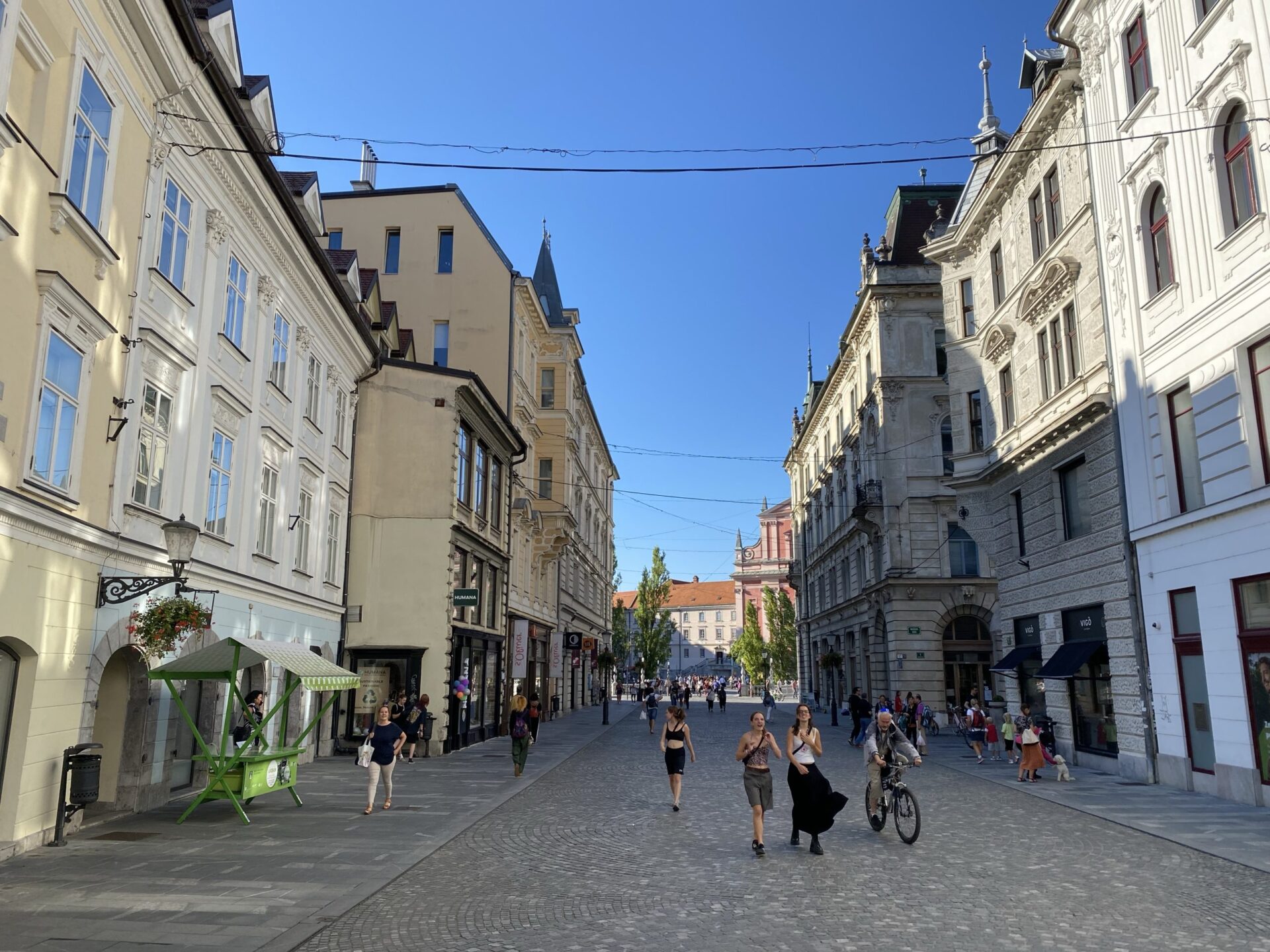 The focus of much of the city is the river. There are cafes and public spaces all along it. The main square is right next to the river and has a very unusual triple bridge spanning the river. in the square there was an amusing artwork creating a small rainy area in the middle of a sunny city. It was nicely done and I imagine would have been very popular earlier in the day!