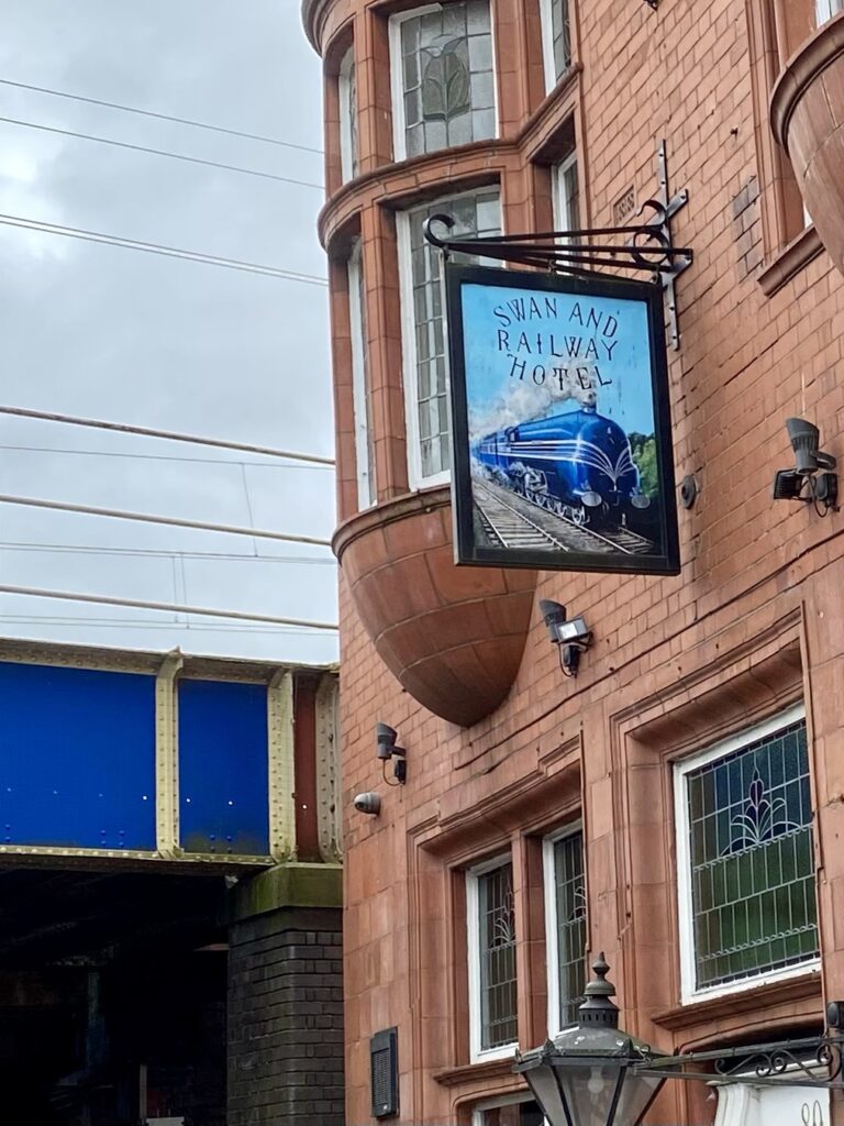 I’ve not done the line from Liverpool to Wigan before, and it was eminently forgettable. Nor have I previously changed trains in Wigan. I took a quick wander outside. The exit from the station is down a rather spartan tunnel. It couldn’t be much less appealing if it tried. Outside, you get more a sense of what it used to be, with bits of faded architectural grandeur. This must have been a lovely area at some point. Pub signs are often worth a look and the one here was very nicely done.