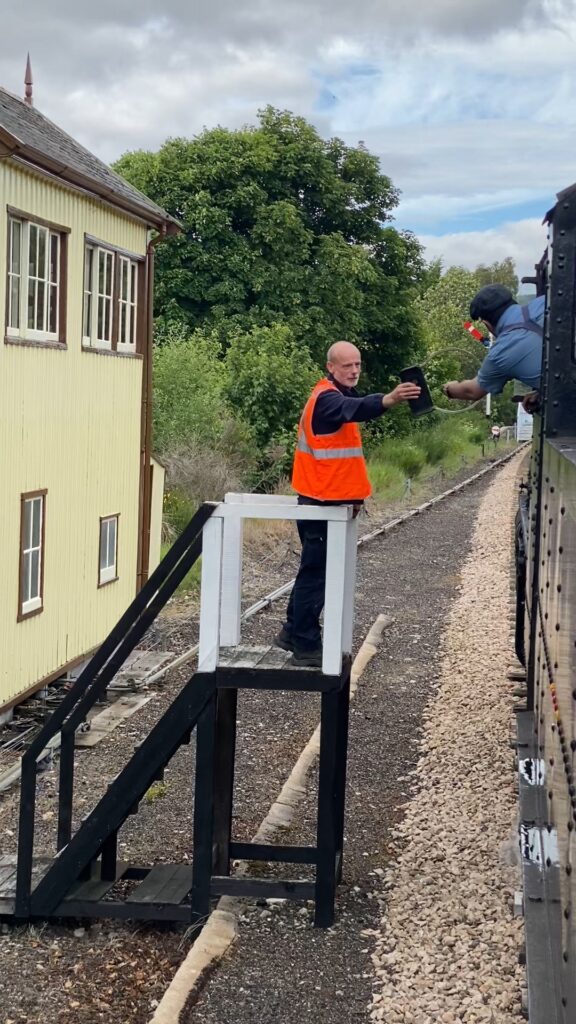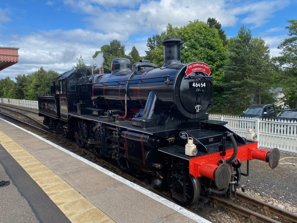 The line is absolutely charming, initially running parallel to the main line, before turning east along the banks of the Spey, with views to the Cairngorms beyond. At Boat of Garten there is a break while water is taken. I would have liked longer here as there was lots to see. We crossed with 46464 again, as this is the only double track section.