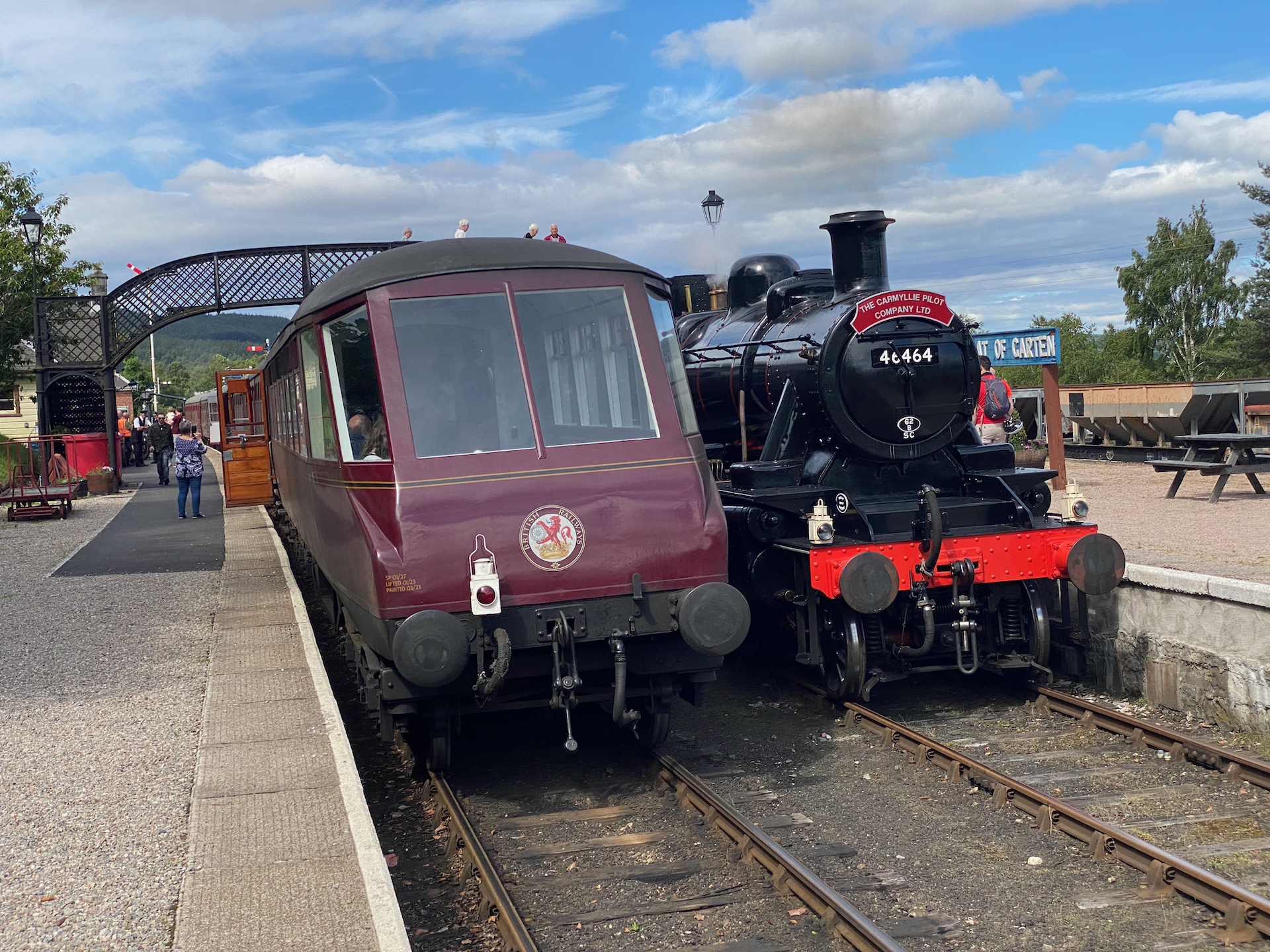 The line is absolutely charming, initially running parallel to the main line, before turning east along the banks of the Spey, with views to the Cairngorms beyond. At Boat of Garten there is a break while water is taken. I would have liked longer here as there was lots to see. We crossed with 46464 again, as this is the only double track section.