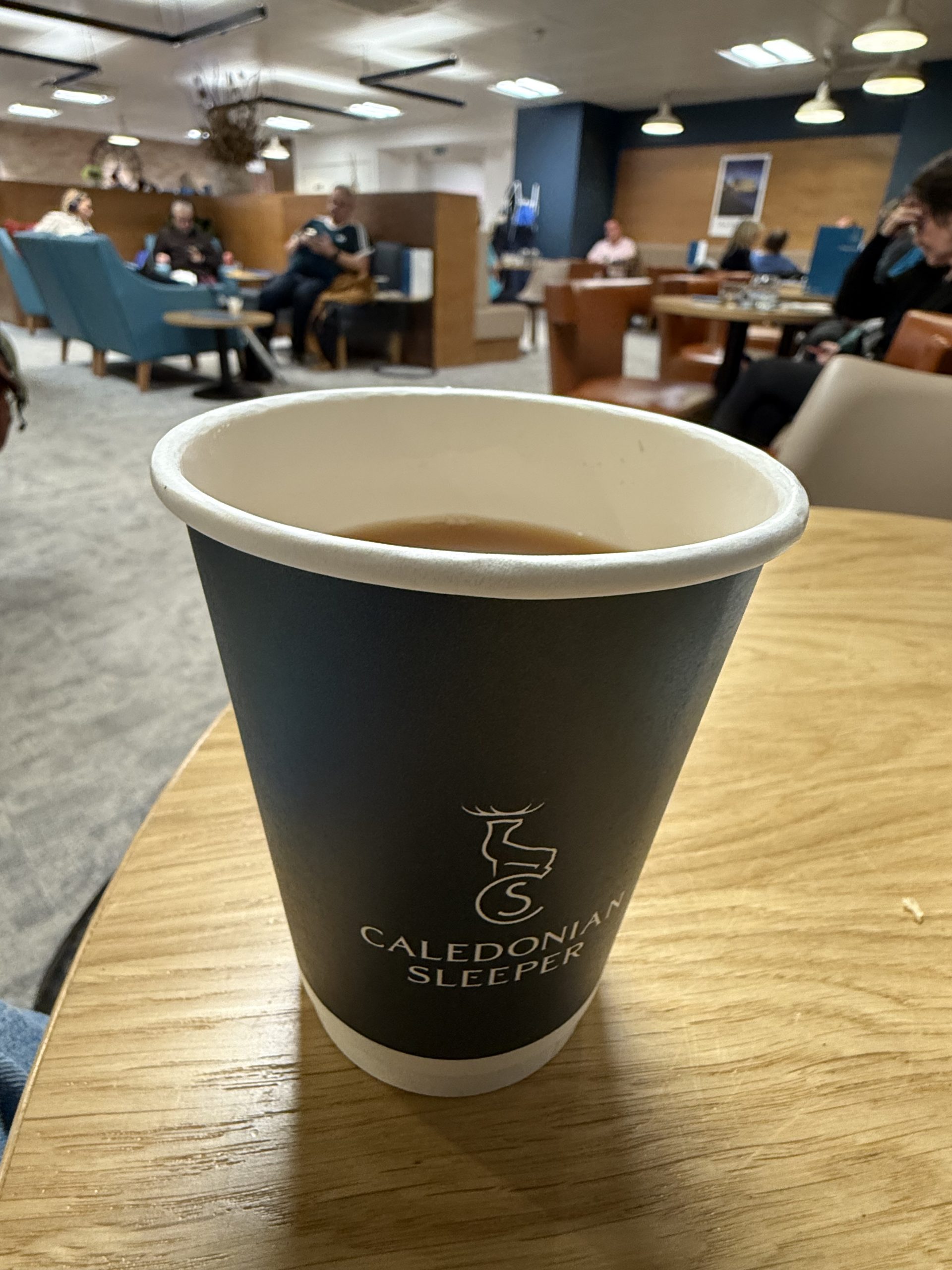 Back at Euston I collected my bag and headed to the Caledonian Sleeper Lounge, with free soft drinks and snacks. I had an orange juice and a banana, but went back for tea and a chocolate brownie.