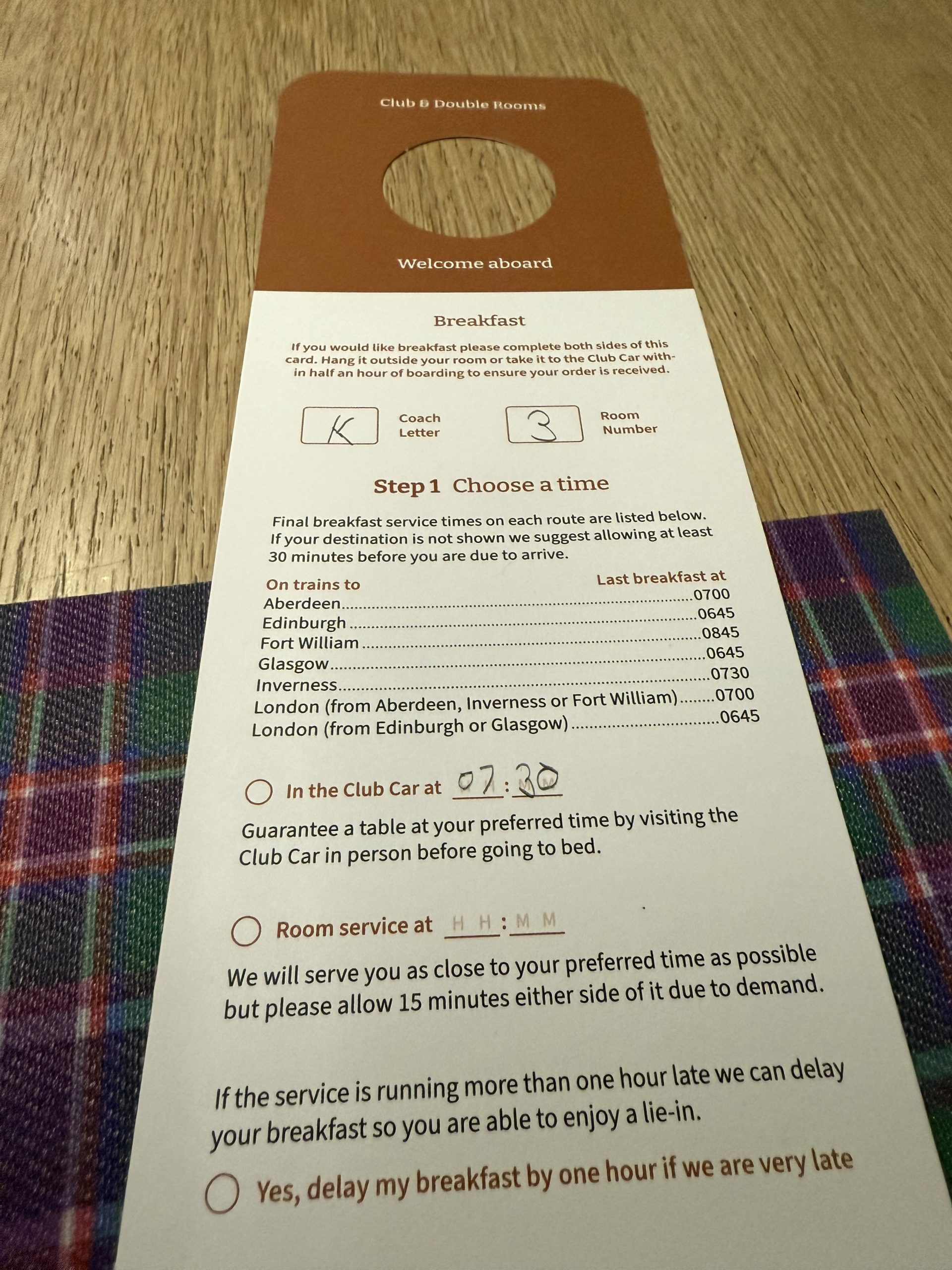 I’d read online that the restaurant car can get busy and especially on a Sunday, so the advice was to drop your bags in your room and get a table straight away. There was time for a look around first, and also to fill in the card they had left for me to select my breakfast.
