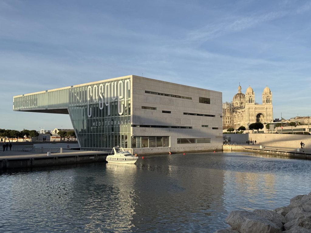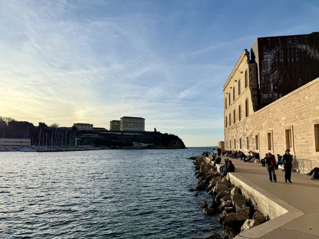 I carried on walking to the fort at the headland, but rather than going inside, continued around the outside. Initially it was a fairly traditional and predictable sight, but on the far side I found two very modern buildings, which were an extension to the fort museum complex, linked by a footbridge. The Museum of European and Mediterranean Civilisations was built when Marseille was European City of Culture in 2013. Just beyond that, Villa Méditerranée is an events and exhibition space, opened the same year.