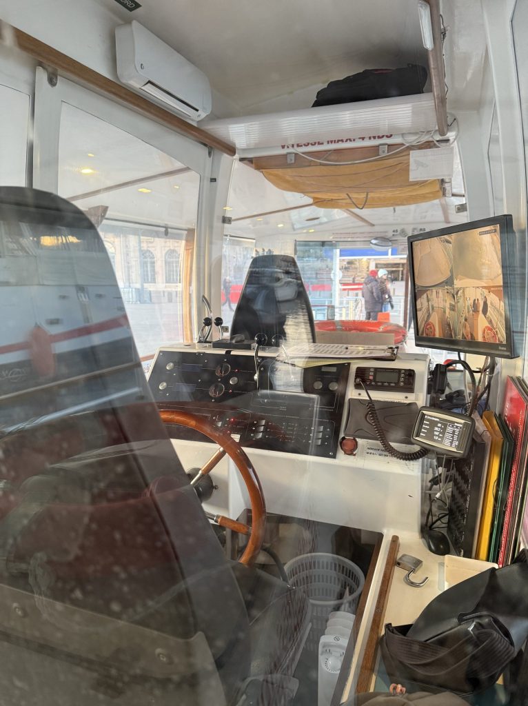 They solve the problem of not turning the boat by having two steering positions facing each other, with mirrored controls, which was novel. When the boat got to the end, I noticed that they don’t moor up, they just leave it in forward gear. I rather liked the older ferry, which was more traditional, moored next to the landing stage.