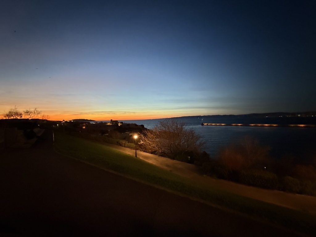 I had earlier thought that I might try to get to the basilica in the above photo. It was the first thing I’d noticed when I came out of the station and is visible from pretty much everywhere in the city. However it had turned cold since the sun went down, and I discovered that the site would close before I got there anyway. I instead walked back to the centre, and after one last look at the harbour headed up the main street back to my hotel.