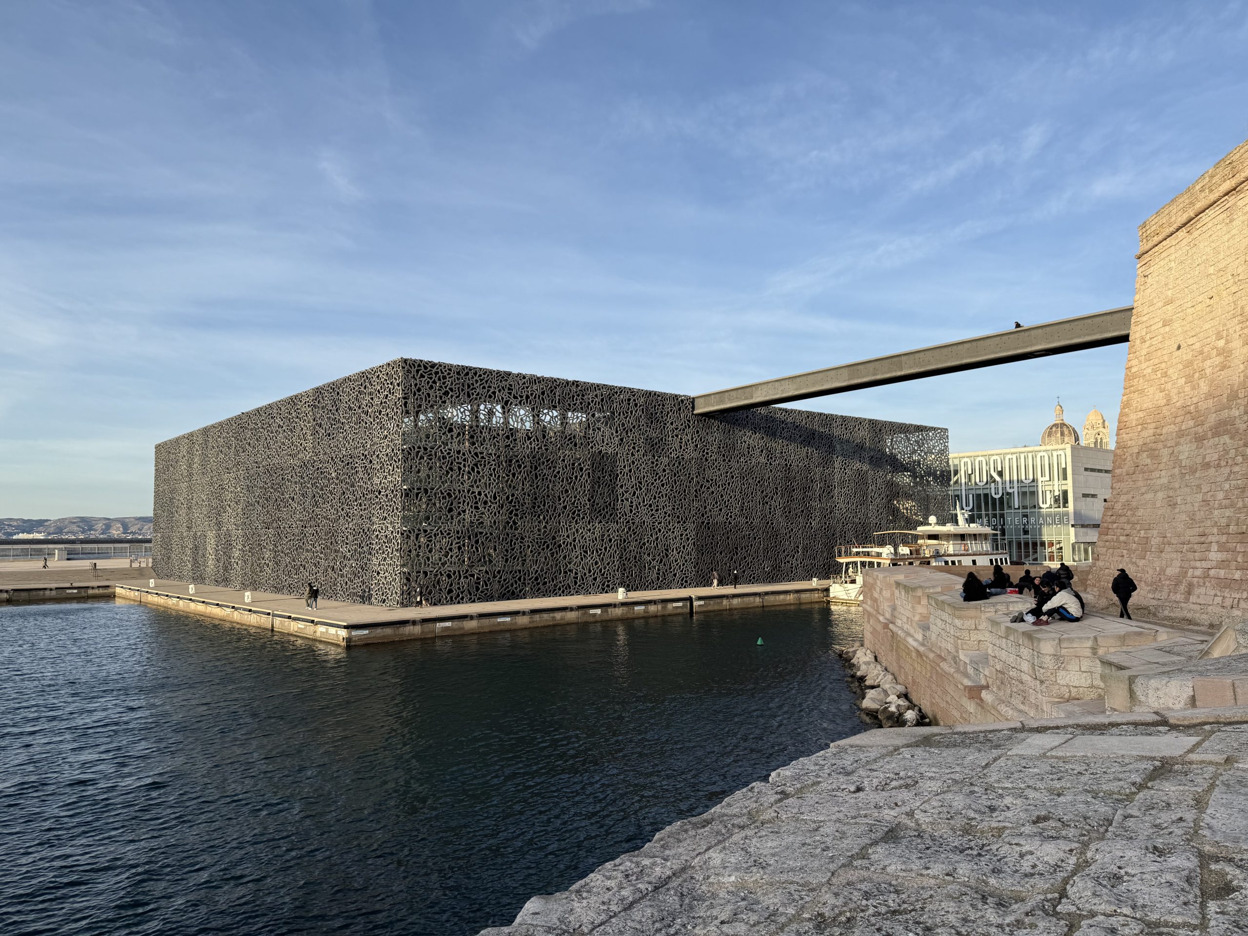 I carried on walking to the fort at the headland, but rather than going inside, continued around the outside. Initially it was a fairly traditional and predictable sight, but on the far side I found two very modern buildings, which were an extension to the fort museum complex, linked by a footbridge. The Museum of European and Mediterranean Civilisations was built when Marseille was European City of Culture in 2013. Just beyond that, Villa Méditerranée is an events and exhibition space, opened the same year.