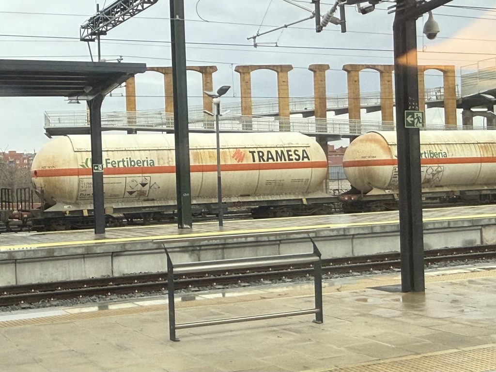 Something that I clearly remembered from the previous trip was the Roman Acueducto de los Milagros, or Aqueduct of the Miracles in Mérida. Oddly you pass it twice, as the train changes direction at the station there, reversing past before continuing in a different direction. While we were paused in the station I spotted a rather odd structure just beyond the station limits and couldn’t decide whether it was functional (though I’m not sure what it might be) or whether it was a stylised modern take on its antique neighbour.