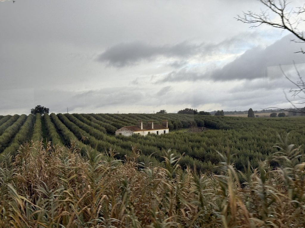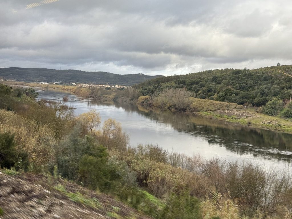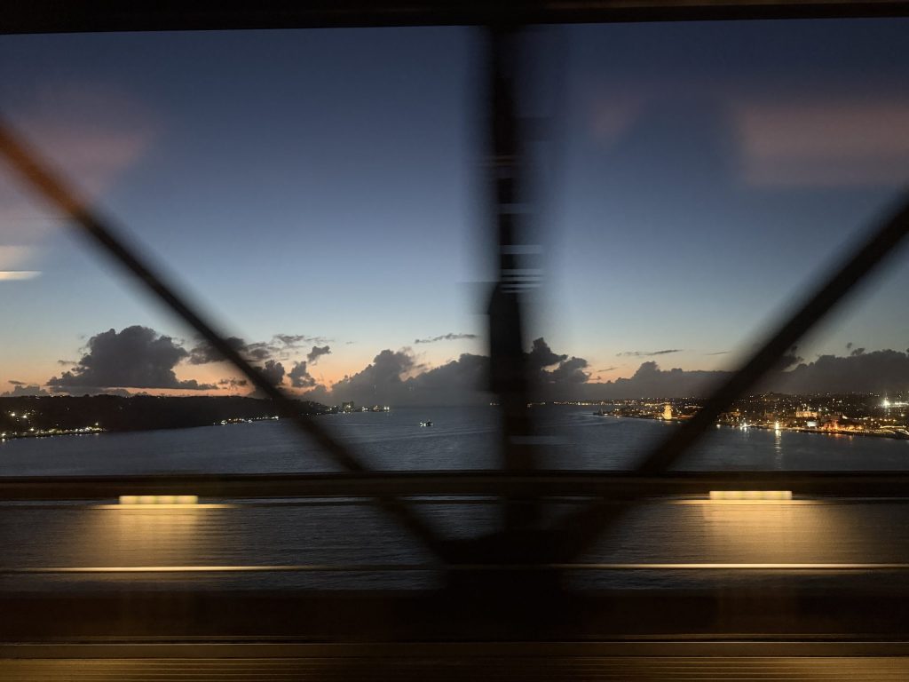 We left the city on a viaduct over the estuary of the Rio Tejo (Tagus River.) I look forward to seeing it from below at some point, but from up high with the sun setting it was certainly a great view, even with the bridge struts in the way.