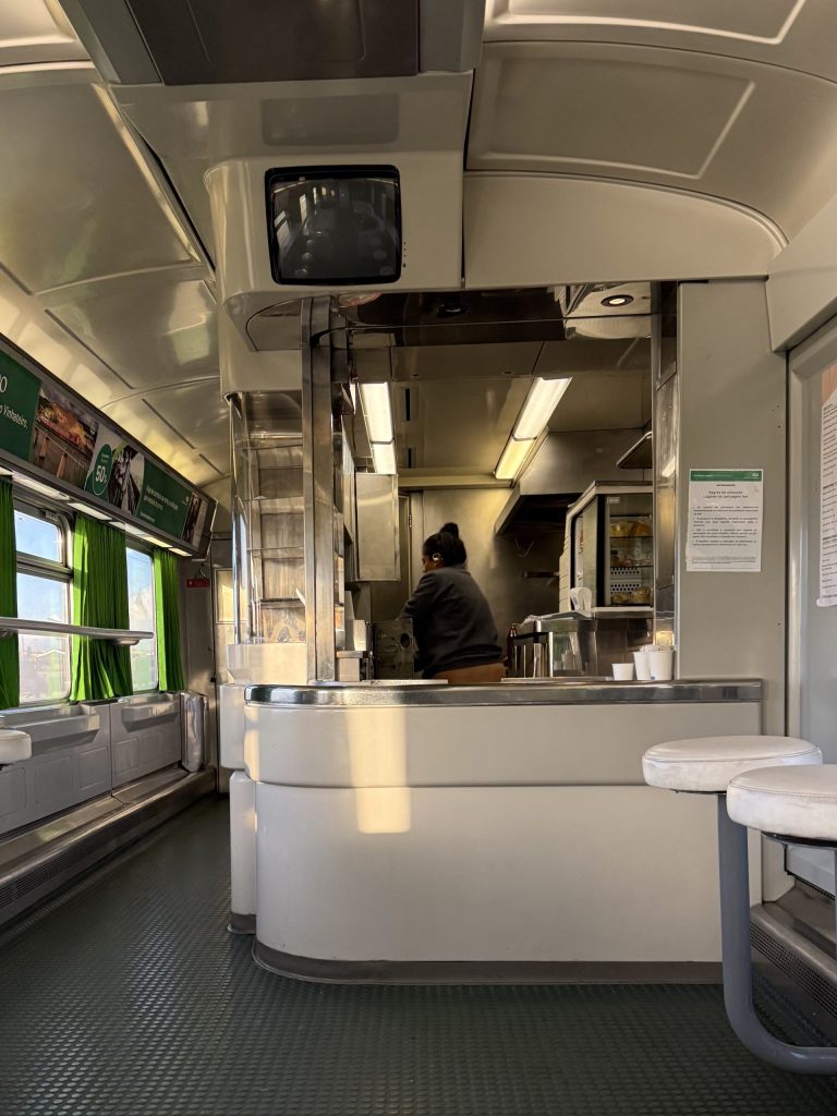 Within a relatively short time, and after one train had passed without stopping, a train pulled in for Lisbon. It turned out to be the one we were meant to get onto, which was even more delayed than ours was. I still didn’t have a reservation so settled down in the buffet car to wait for the train manager.