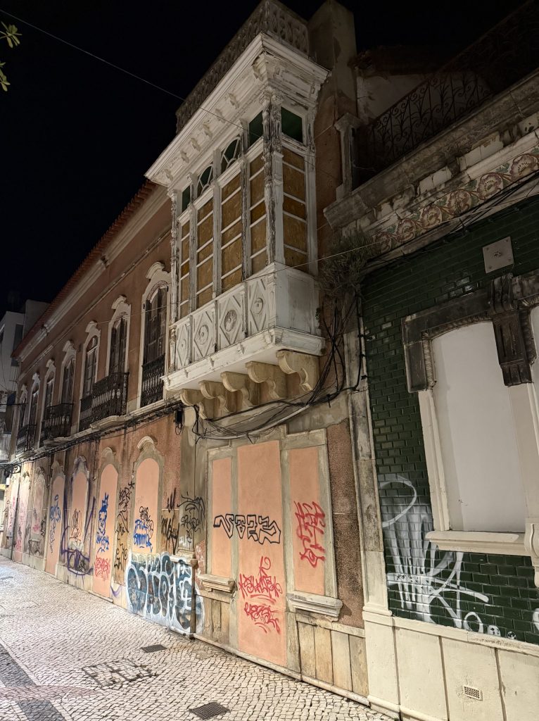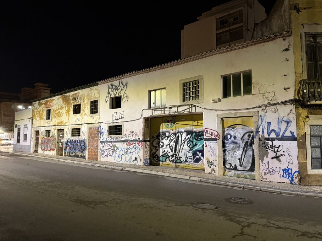 We arrived into Faro half an hour behind schedule. The first thing I noticed after getting off the train was that it was pleasantly warm, I certainly didn’t need a coat though by now it was well after 9pm. A couple of days earlier I’d been bitterly cold in Marseille at this time of the evening. The second thing I noticed was that this was a town with more than its fair share of derelict buildings.