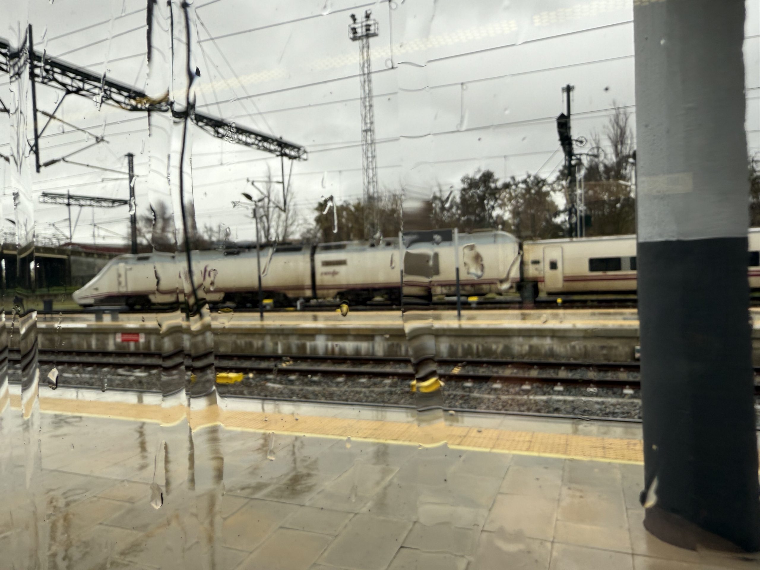 As we pulled out, the Renfe train was being parked in a siding before its return to Madrid, later in the day. I felt sorry for the dispatcher on the platform in the rain, but he did make for a good photo!