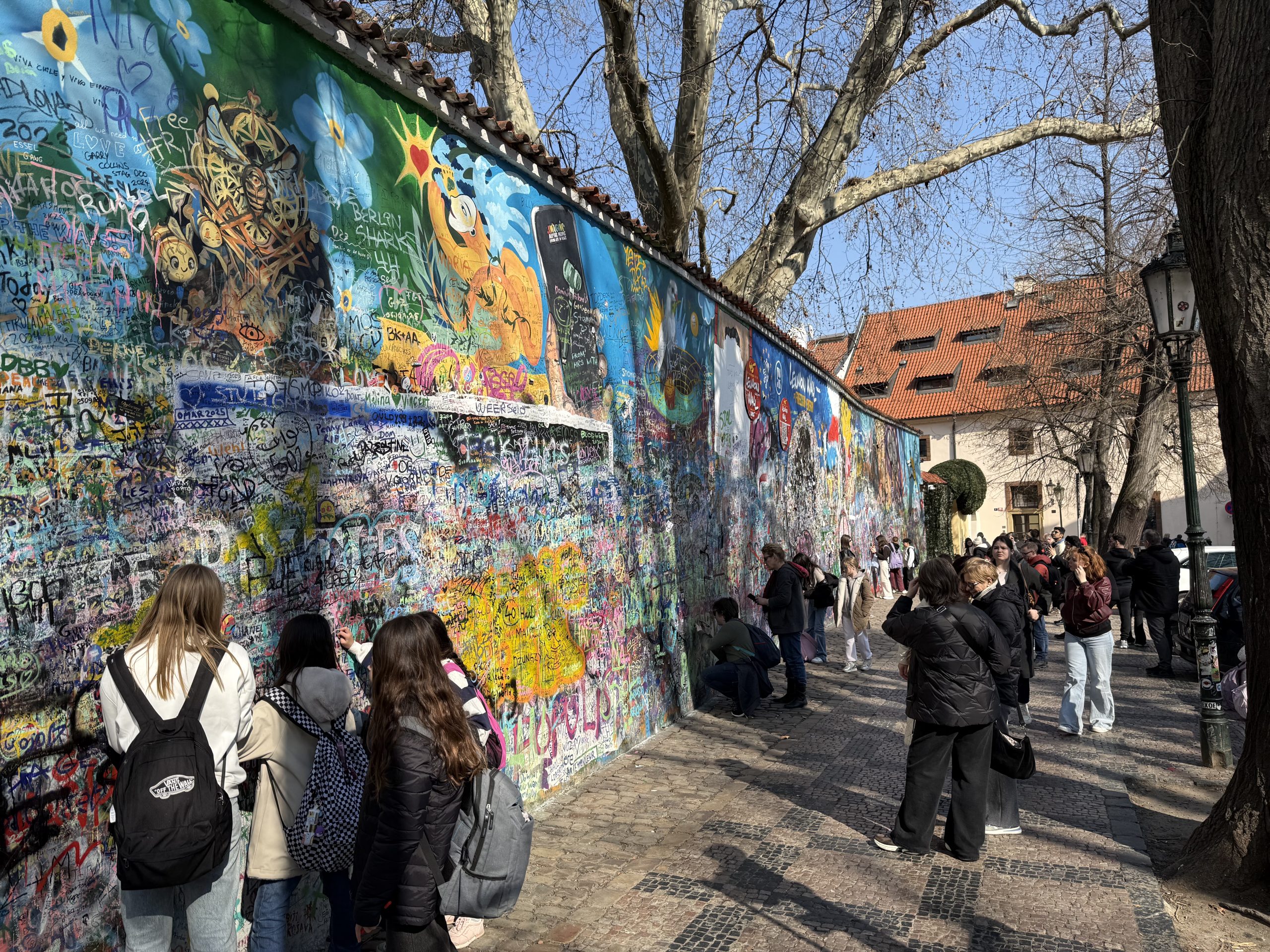 Visitors still add messages and images to the wall and this is legally permitted. Every few years the wall is completely overpainted, reflecting important social or environmental themes, but the Lennon connection is always retained. Whilst I was there a group of schoolchildren were being told about it, then given the opportunity to add their own messages.