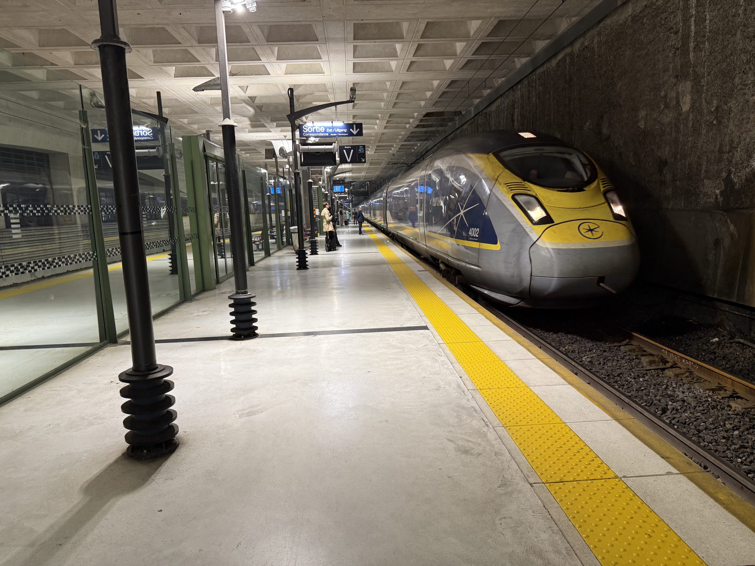 The train pulled in on the platform next to where Eurostar departs, but the two are separated by a tall barrier.