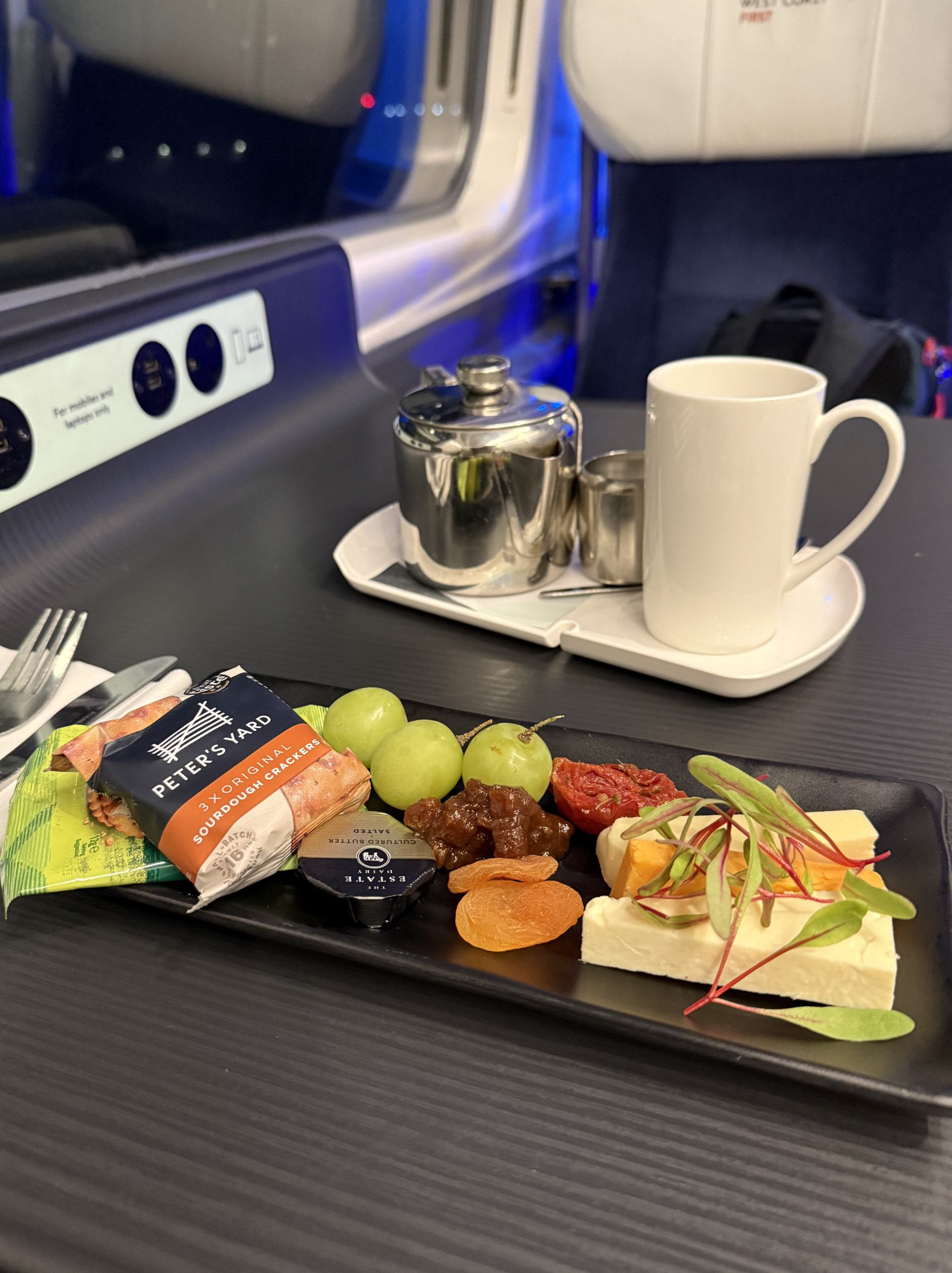 I wasn’t expecting there to be any First Class catering on a Sunday night train so had picked up a Cornish pasty on the concourse, but I was handed a menu as I sat down. I accepted the offer of a pot of tea and a cheeseboard.